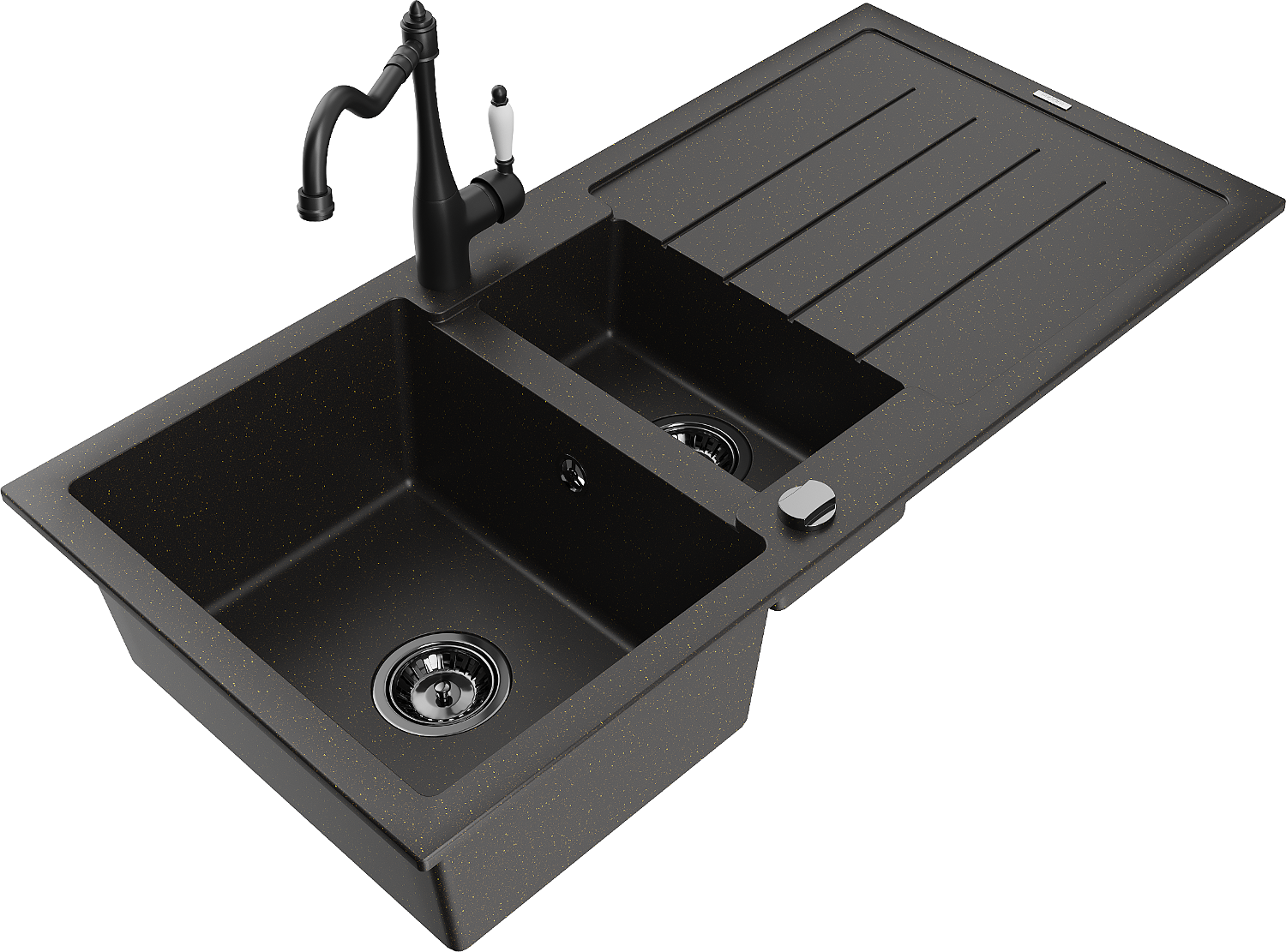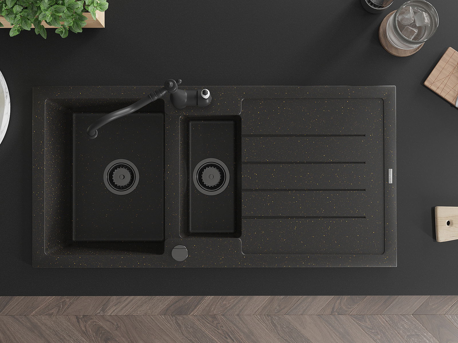 Mexen Andres žulový drez 1,5-komorový s odkvapkávačom a kuchynskou batériou Carla, čierny/zlatý - 6515-75-670700-70-B