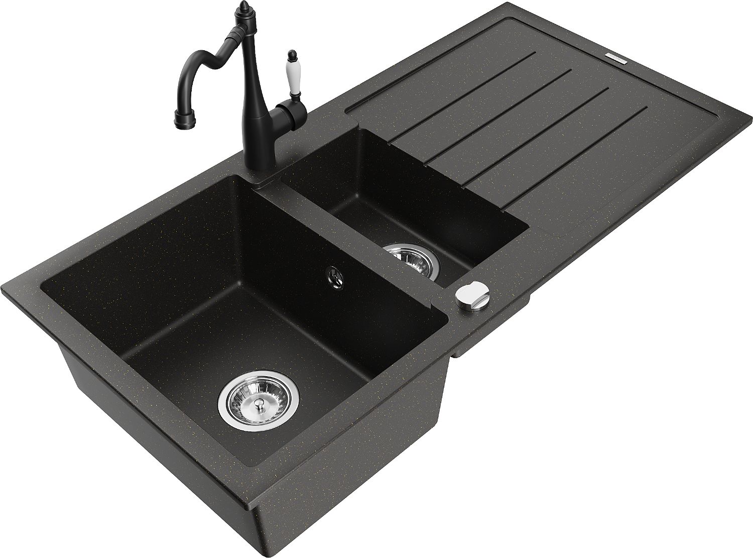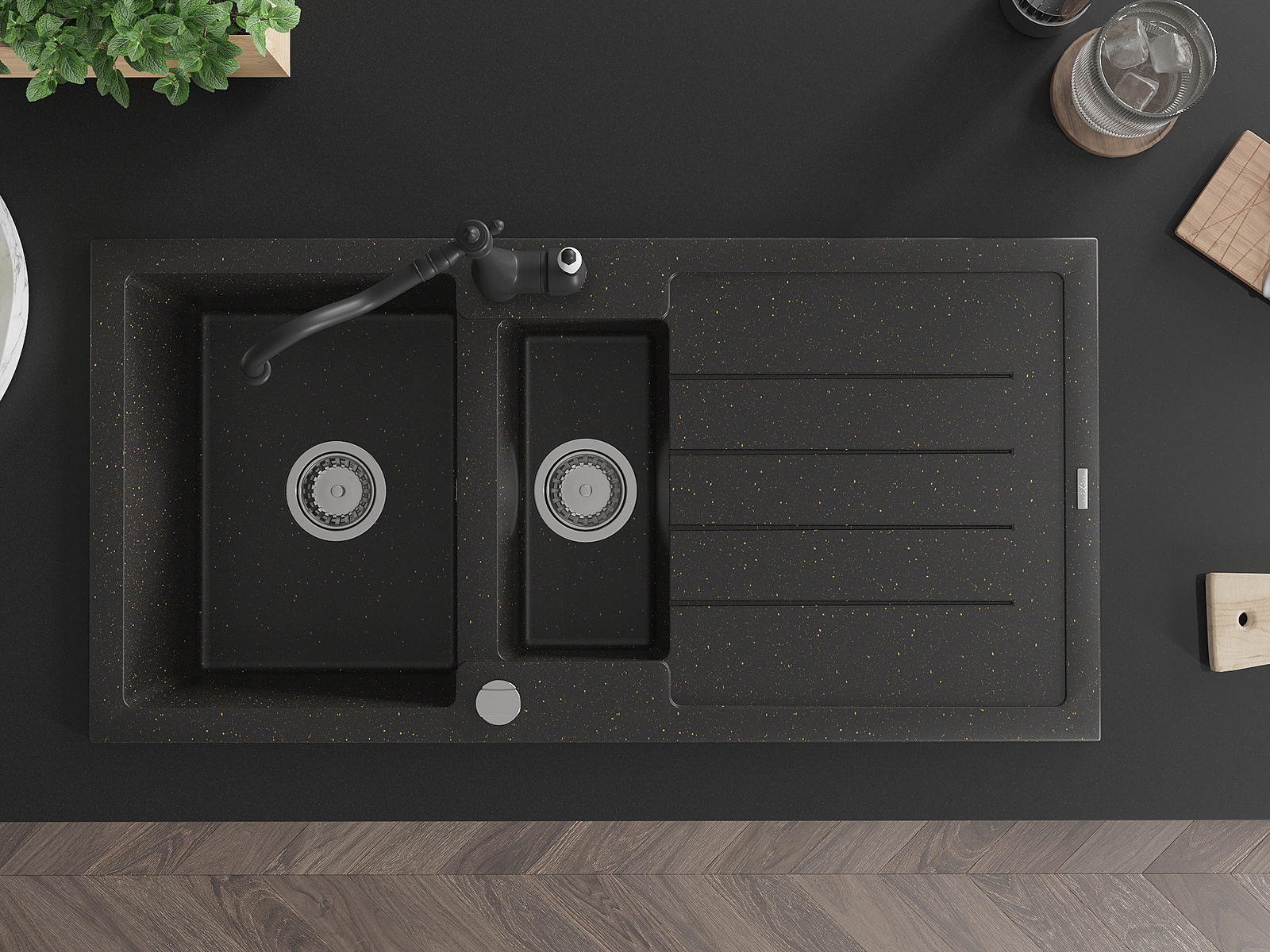 Mexen Andres granitový drez 1,5-komorový s odkvapkávačom a kuchynskou batériou Carla, čierny/zlatý - 6515-75-670700-70