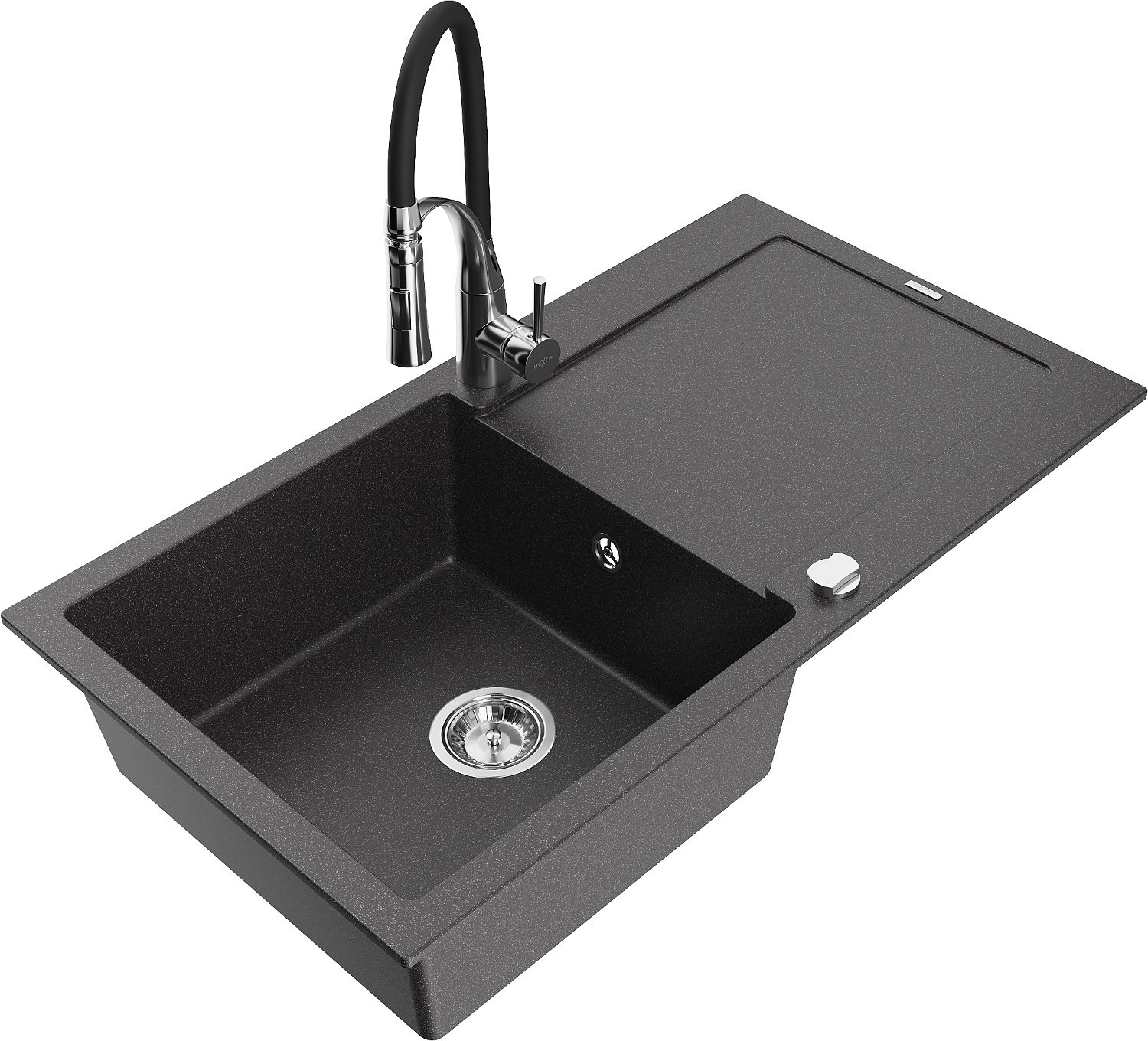 Mexen Leo granitový drez s 1 komorou, odkvapkávačom a kuchynskou batériou Aster, čierny škvrnitý - 6501-76-73450-07