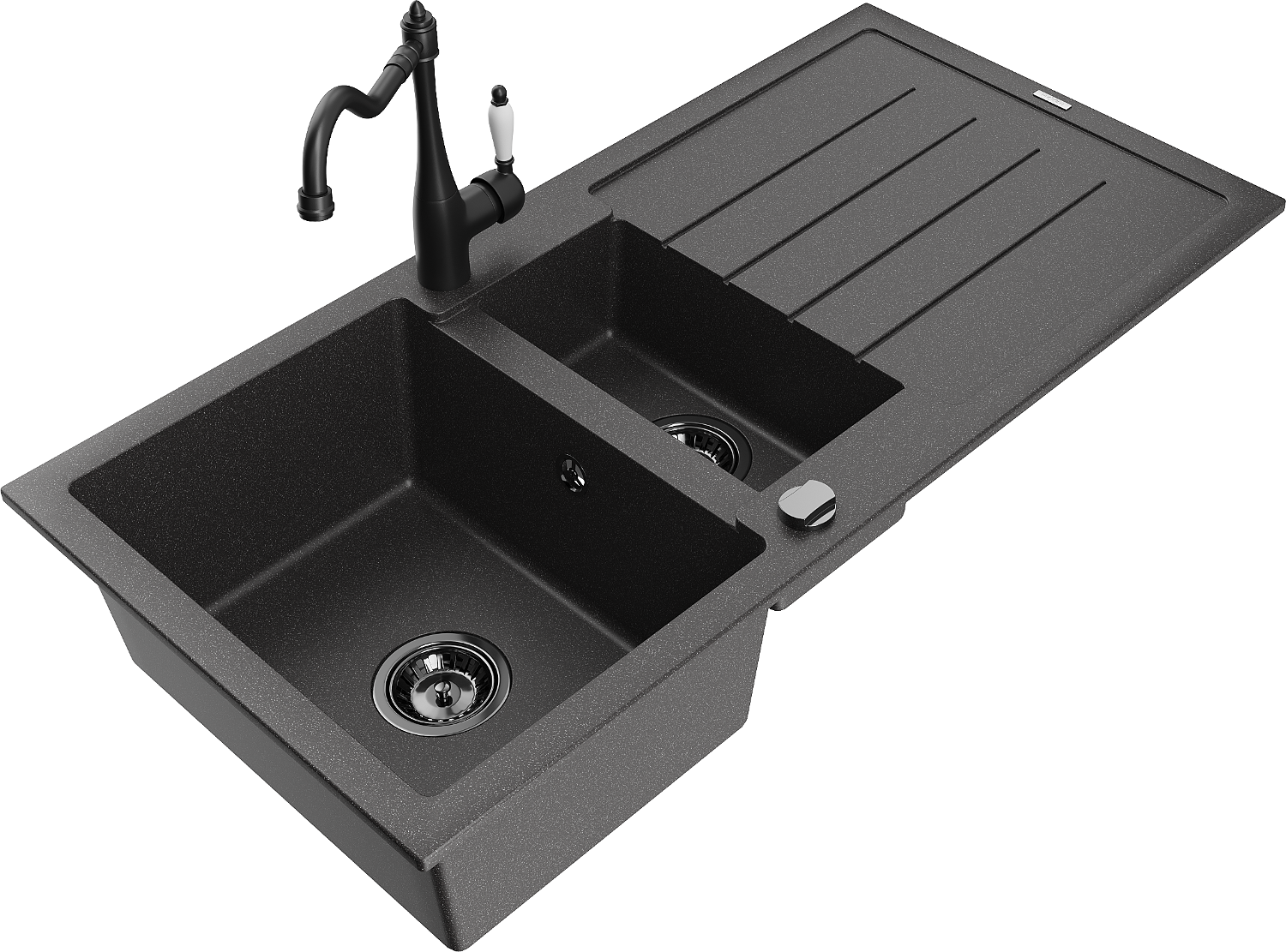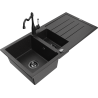 Mexen Andres granitový drez s 1,5 komorou s odkvapkávačom a kuchynskou batériou Carla, čierny bodkovaný
