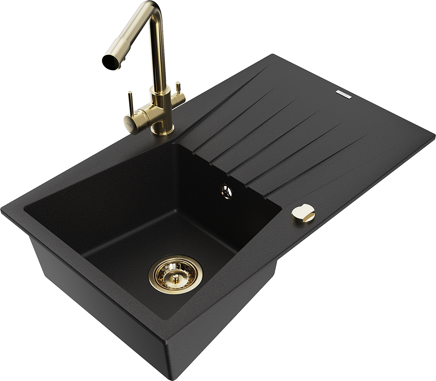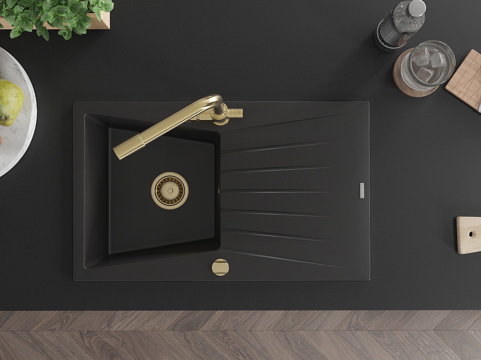 Mexen Cesar granitový drez s 1 komorou a odkvapkávačom a kuchynskou batériou Duero, čierny - 6514-77-671600-50