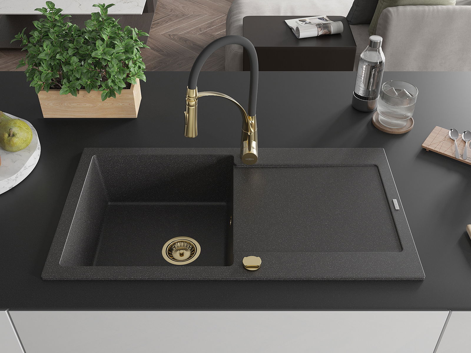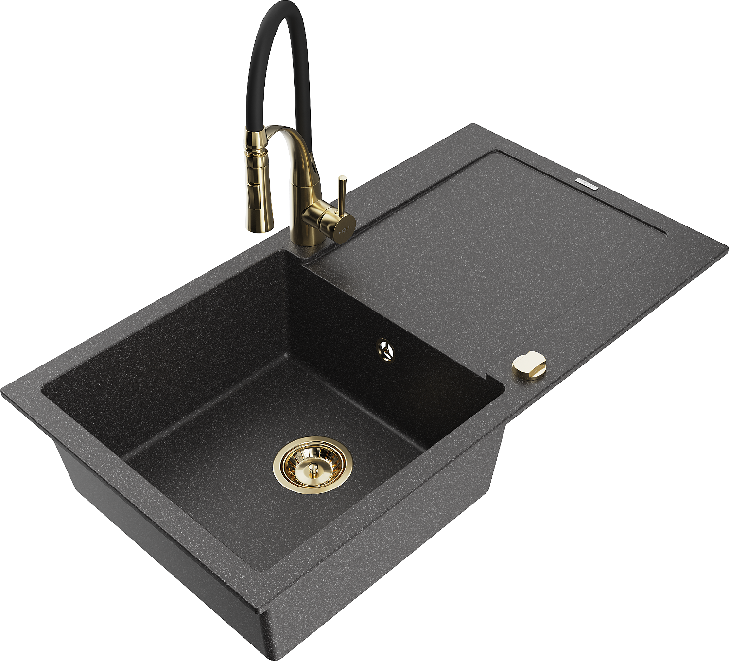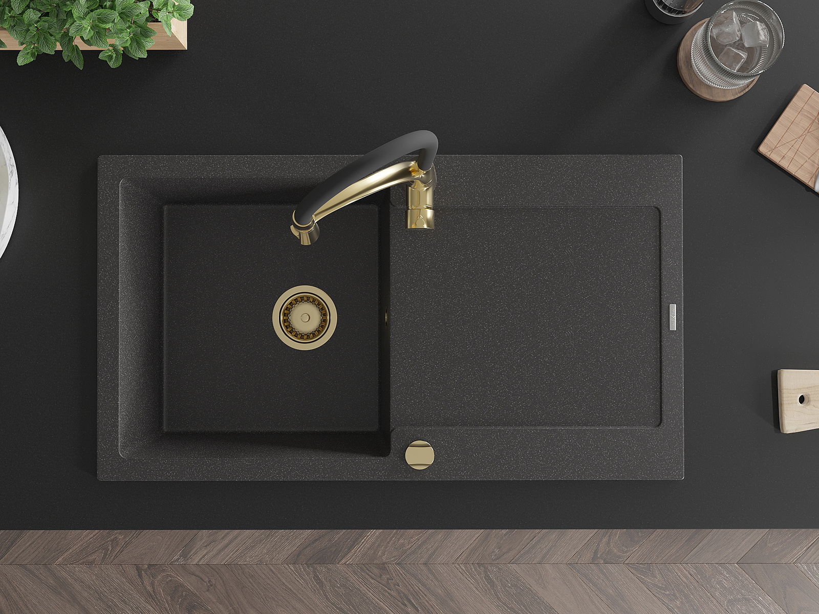 Mexen Leo granitový drez s 1 komorou s odkvapkávačom a kuchynskou batériou Aster, čierny škvrnitý - 6501-76-73450-57-G