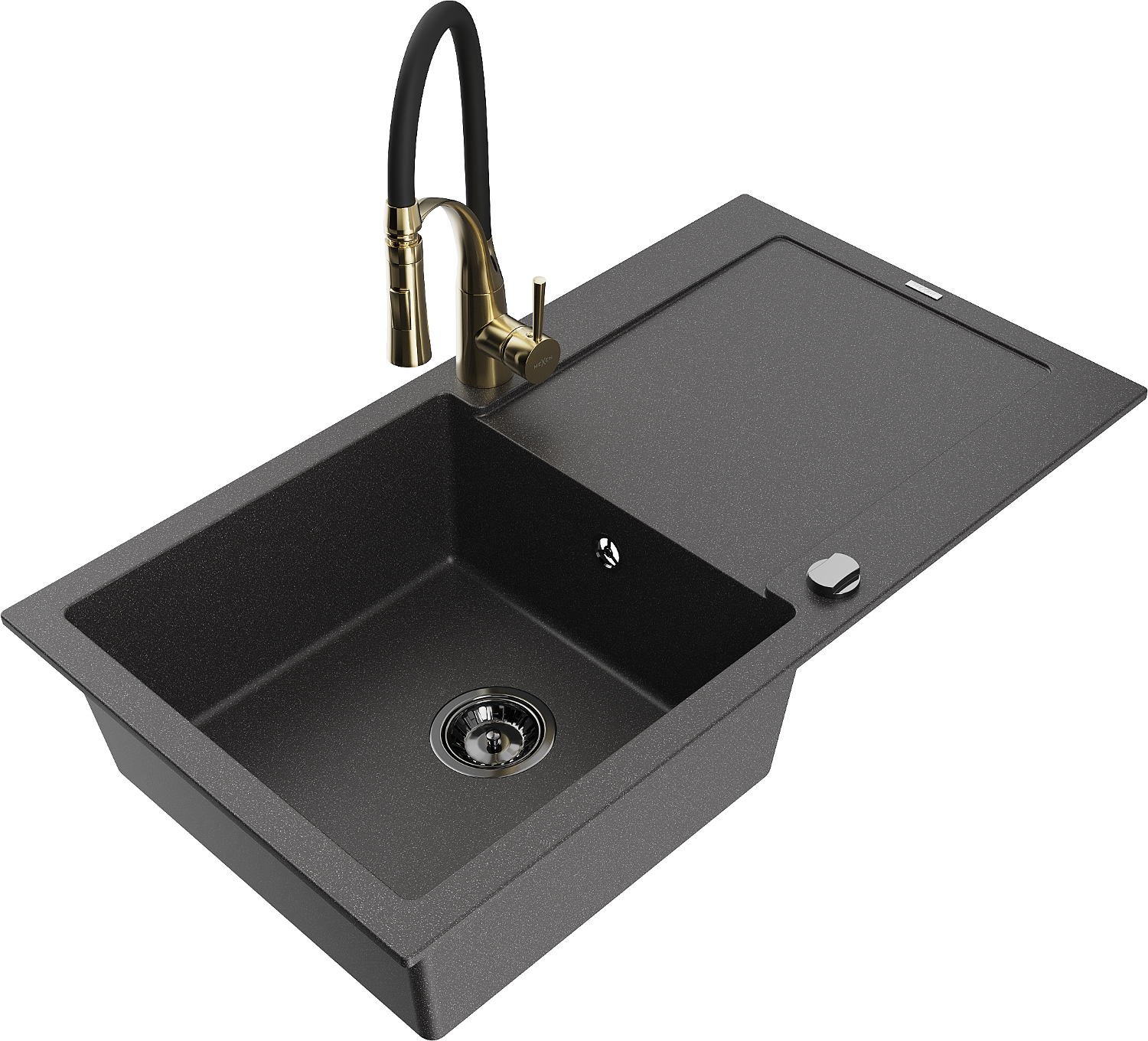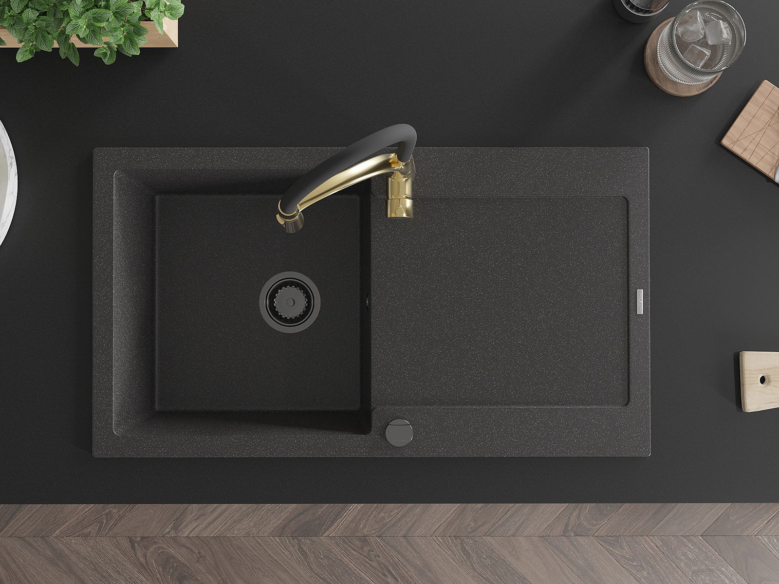 Mexen Leo žulový jednodrezový kuchynský drez s odkvapkávacou plochou a kuchynskou batériou Aster, čierny škvrnitý
