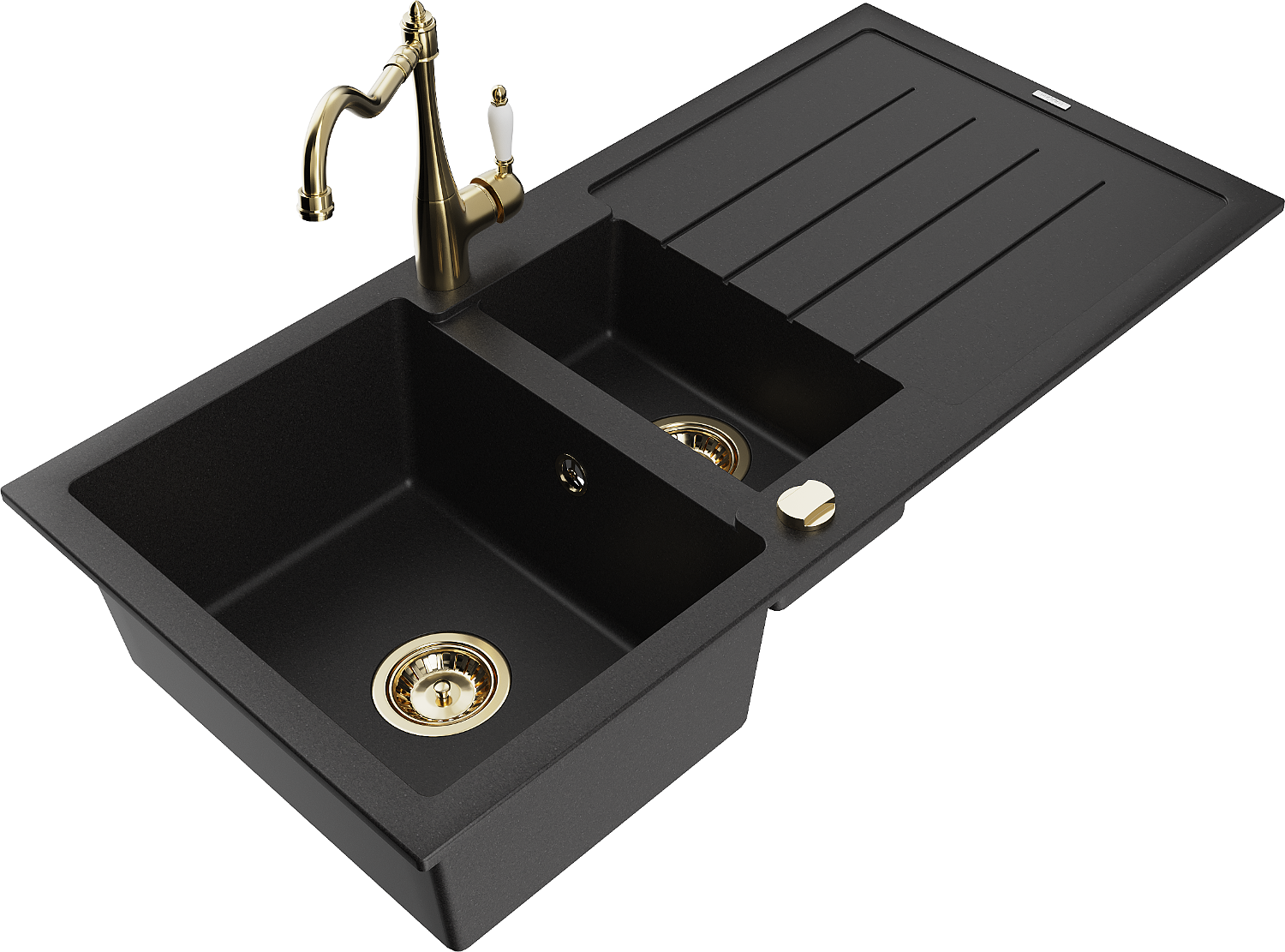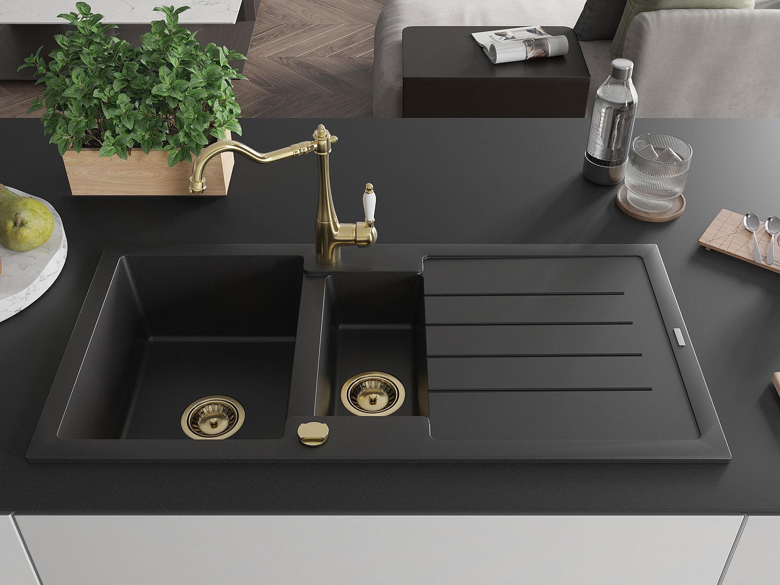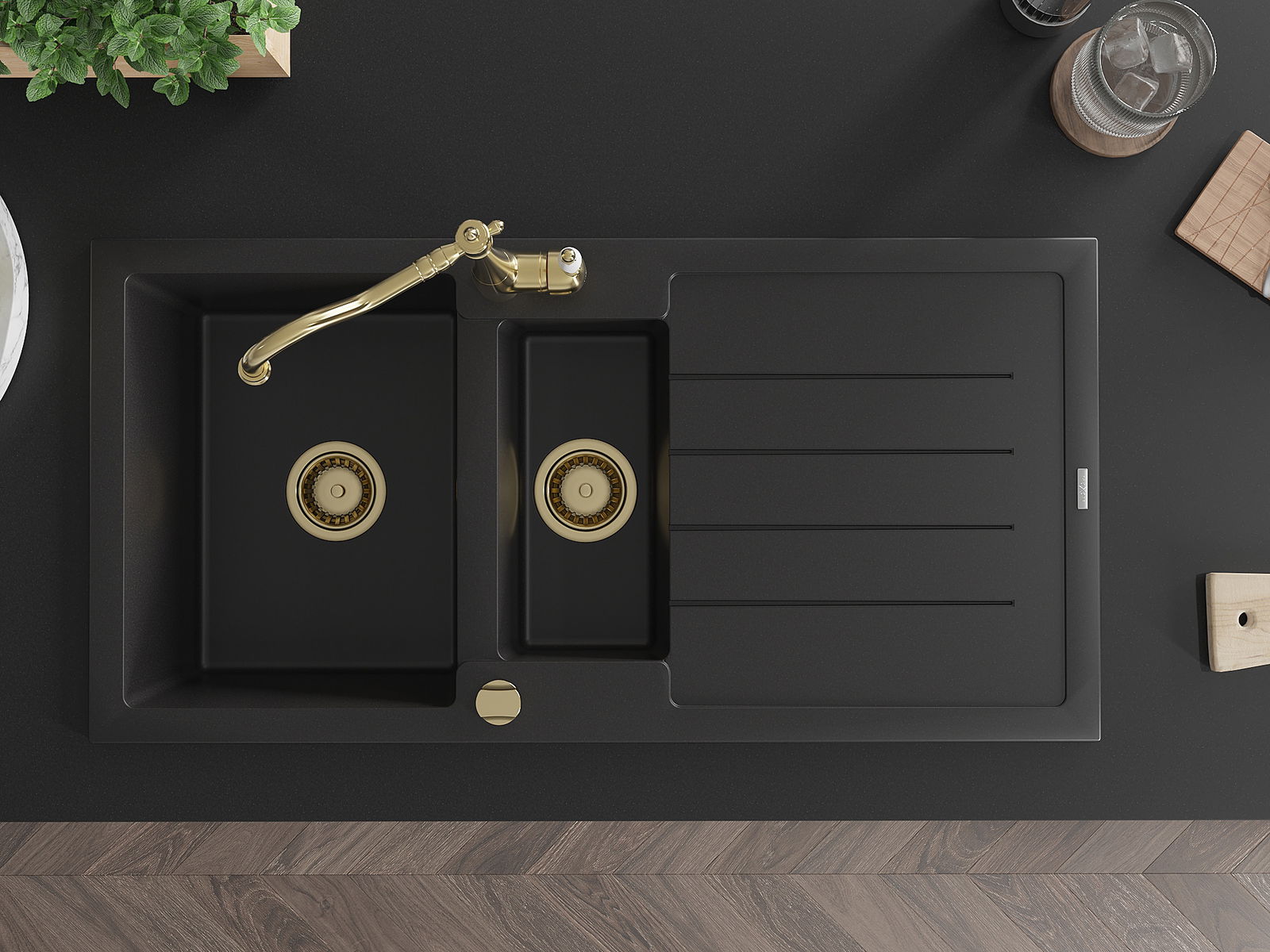 Mexen Andres žulový drez 1,5-komorový s odkvapkávačom a kuchynskou batériou Carla, čierny - 6515-77-670700-50