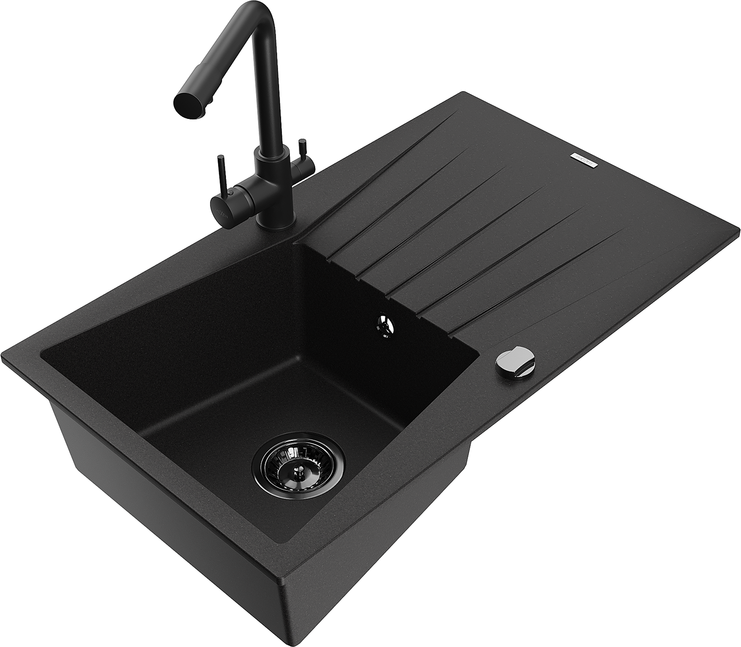 Mexen Cesar žulový kuchynský drez 1-komorový s odkvapkávačom a kuchynskou batériou Duero, čierny - 6514-77-671600-70-B