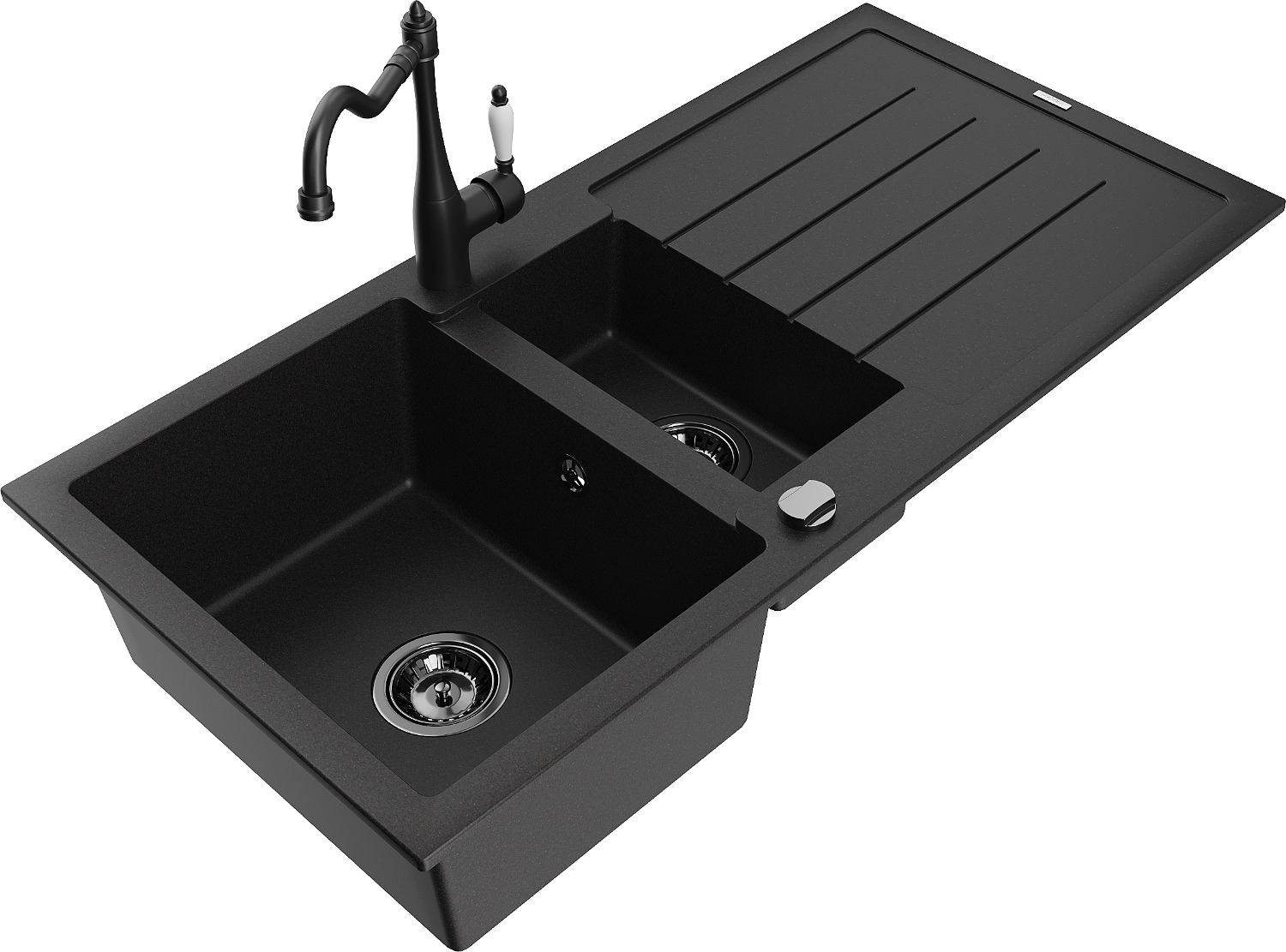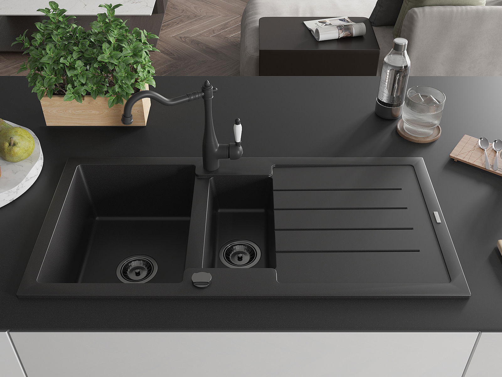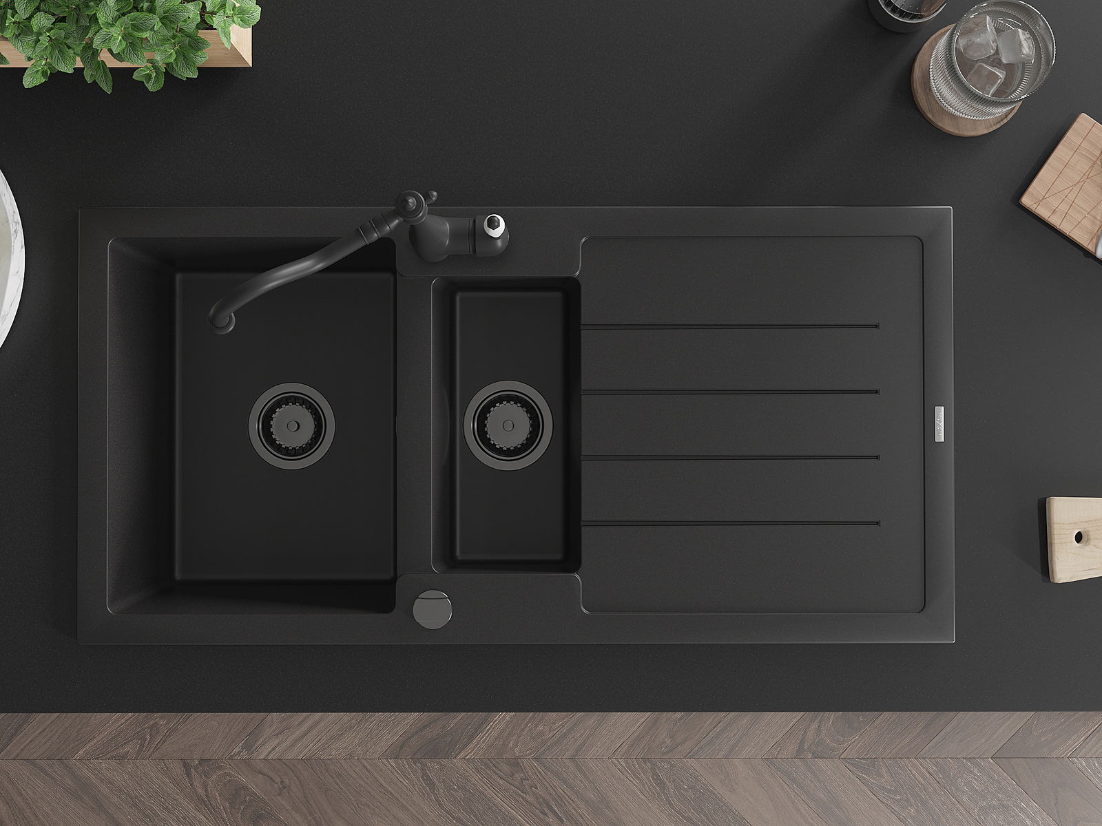 Mexen Andres granitový drez 1,5-komorový s odkvapkávačom a kuchynskou batériou Carla, čierny - 6515-77-670700-70-B