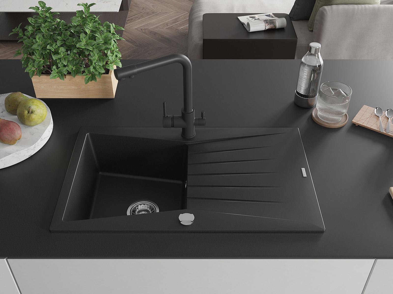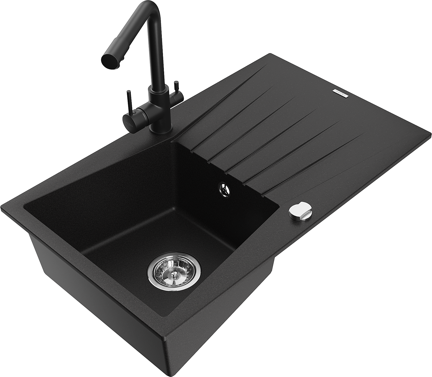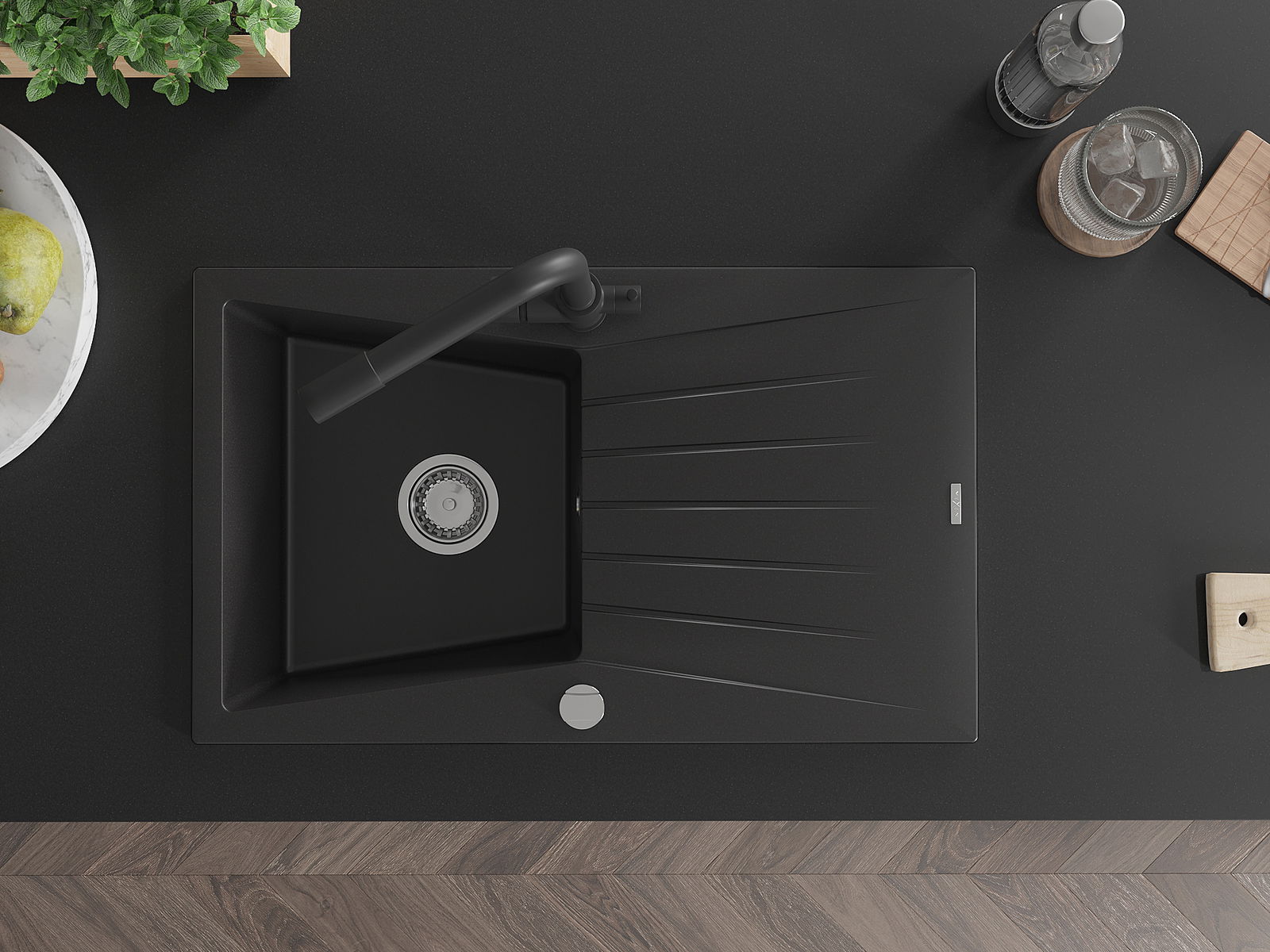 Mexen Cesar žulový drez s 1 komorou, odkvapkávacou plochou a kuchynskou batériou Duero, čierny - 6514-77-671600-70