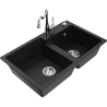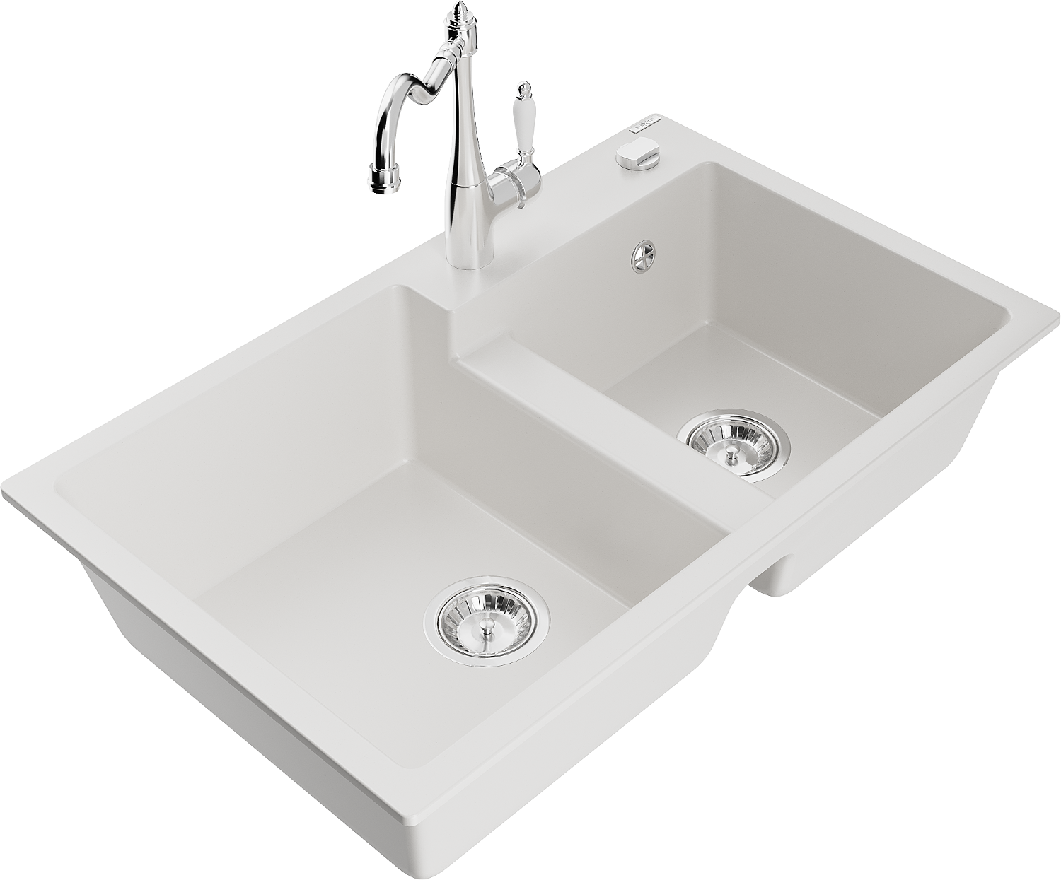 Mexen Tomas žulový drez, 2-komorový s kuchynskou batériou Carla, biely - 6516-20-670700-00