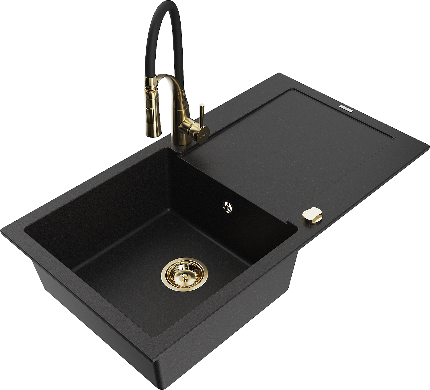 Mexen Leo granitový kuchynský drez s 1 komorou a odkvapkávacou plochou a kuchynskou batériou Aster, čierny - 6501-77-73450-57-G