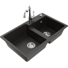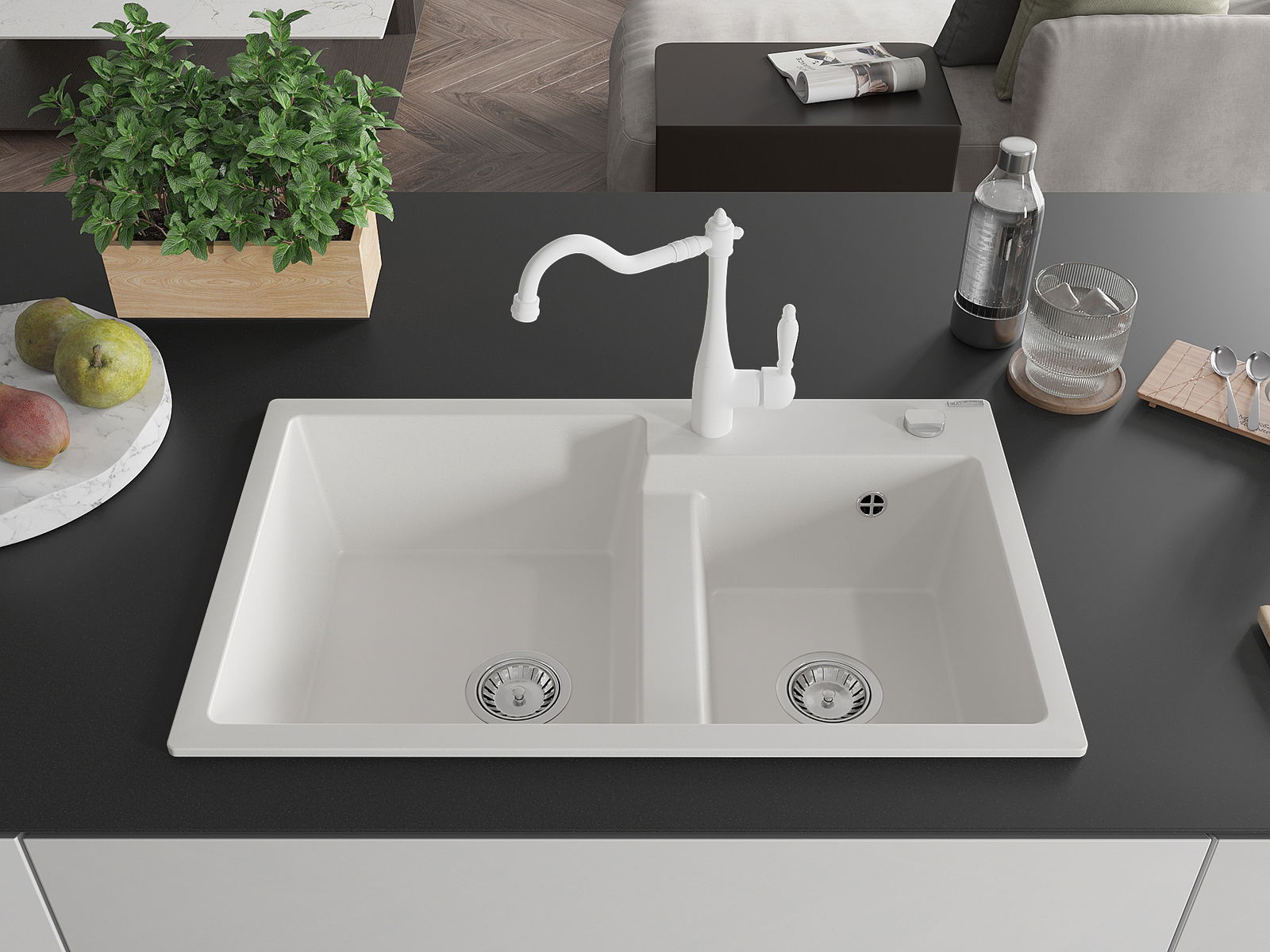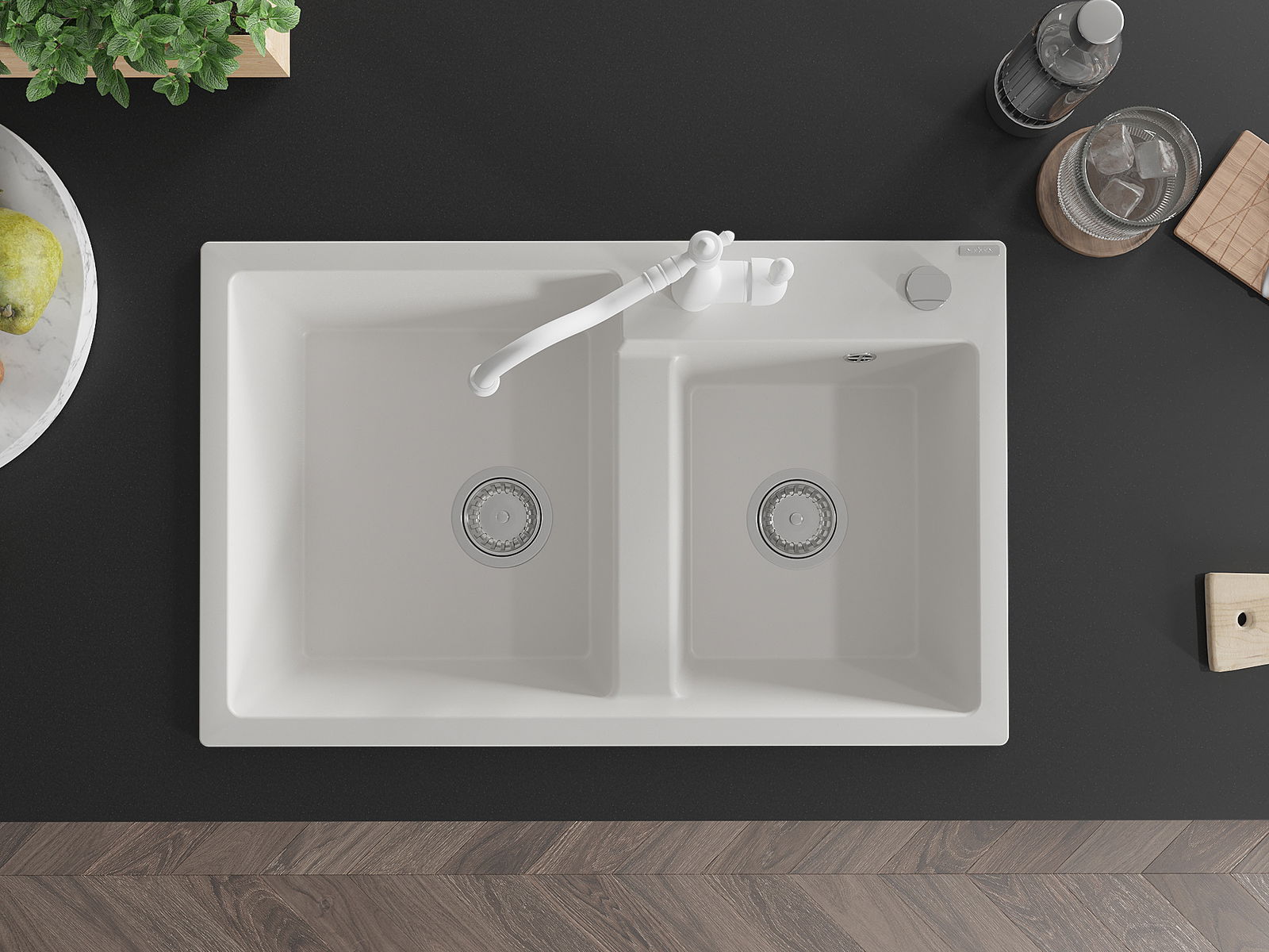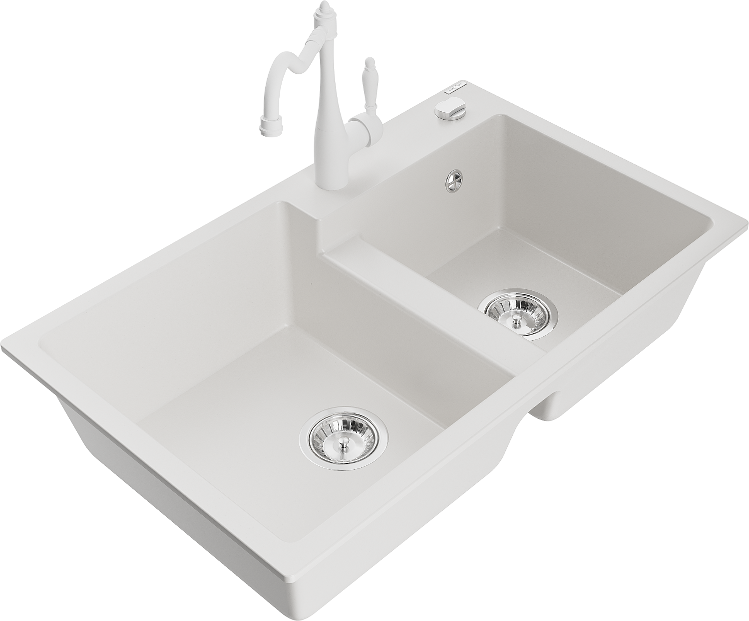 Mexen Tomas žulový dvojkomorový drez s kuchynskou batériou Carla, biely - 6516-20-670700-20