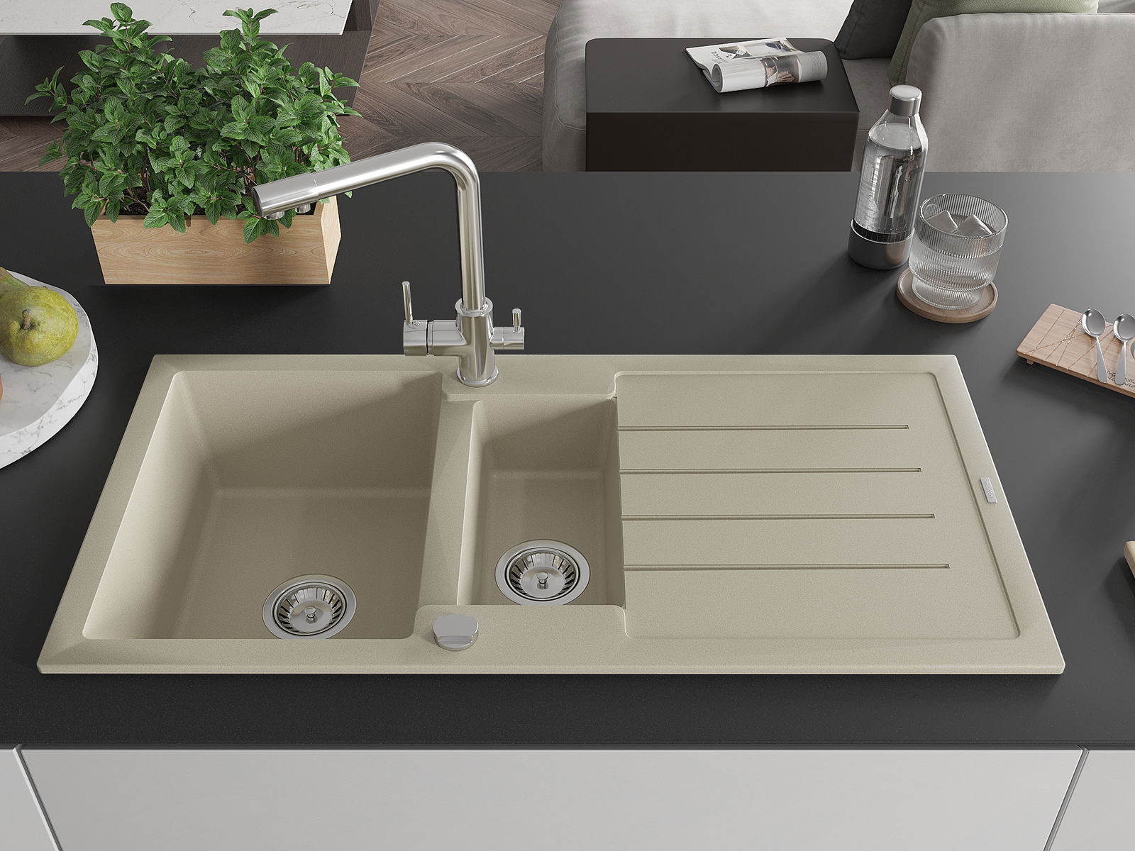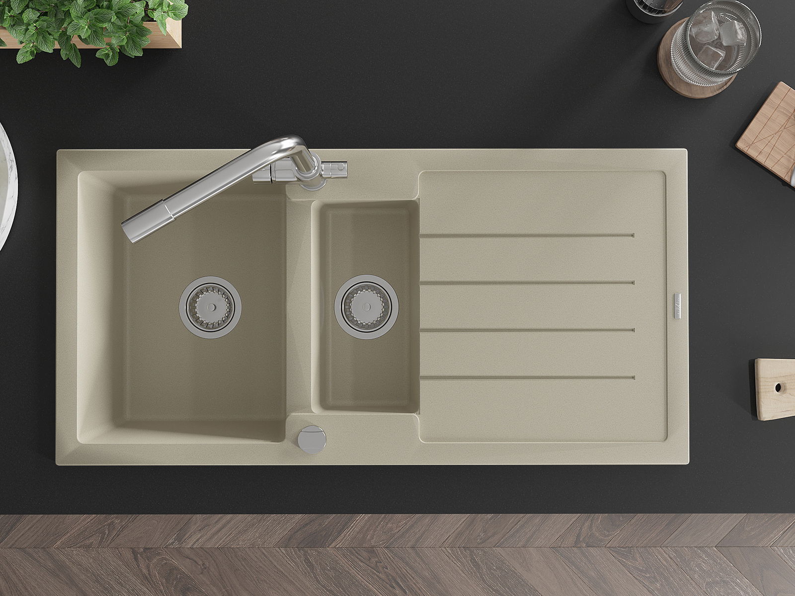 Povrch kuchynského drezu je odolný voči škvrnám a zafarbeniu, vďaka čomu sa ľahko udržiava a zachováva svoju farbu počas dlhého obdobia používania. Estetický a praktický doplnok pre každú kuchyňu.