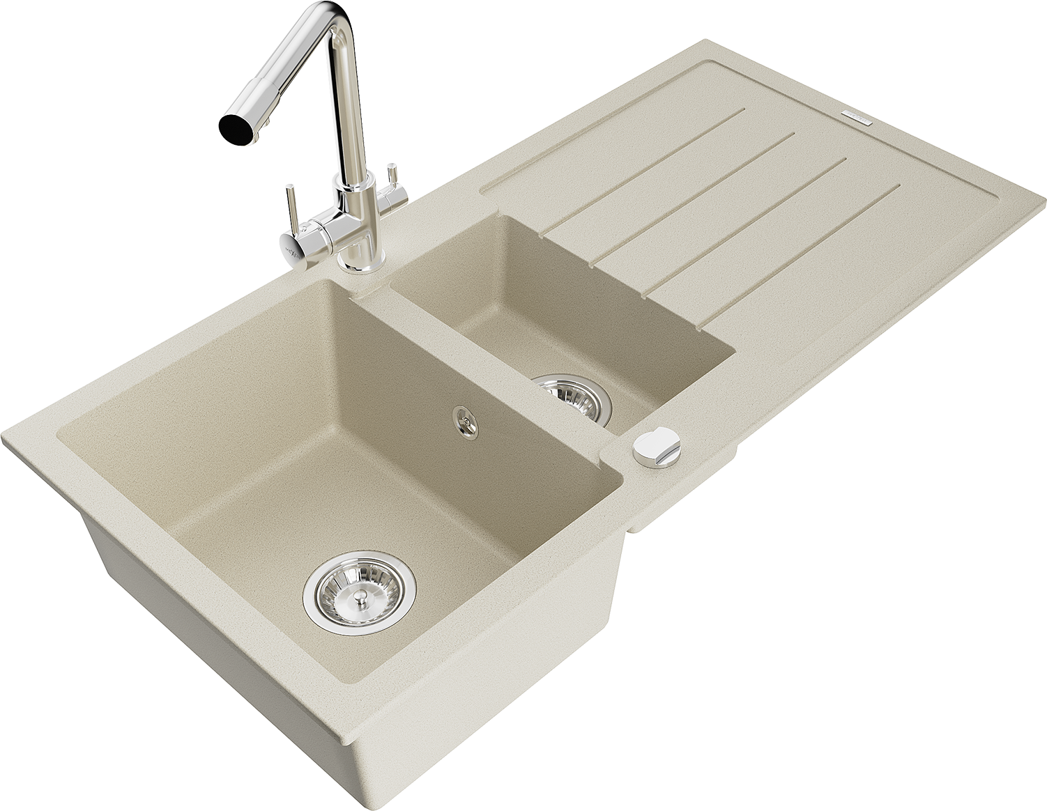 Mexen Andres granitový drez 1,5-komorový s odkvapkávačom a kuchynskou batériou Duero, béžový - 6515-69-671600-00
