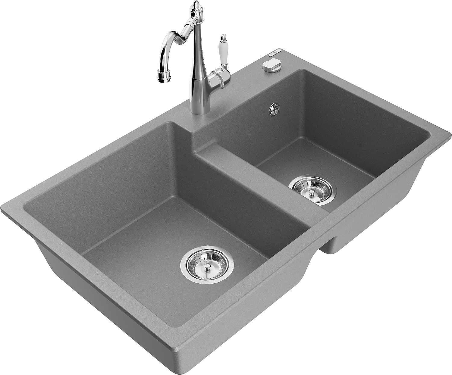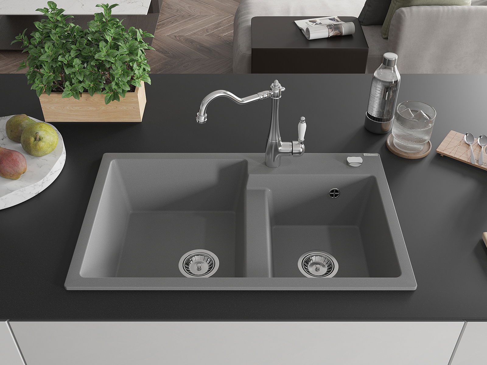 Mexen Tomas žulový drez s 2 komorami a kuchynskou batériou Carla, sivý - 6516-71-670700-00