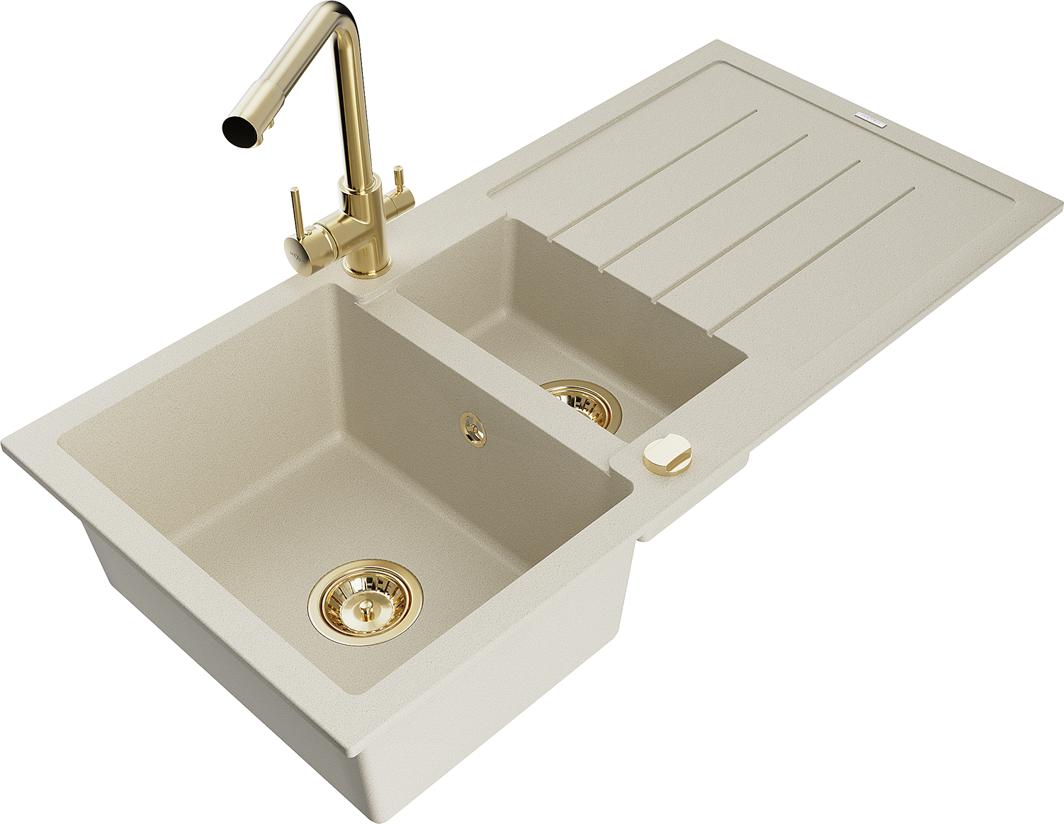 Mexen Andres žulový kuchynský drez 1,5-komorový s odkvapkávačom a kuchynskou batériou Duero, béžový - 6515-69-671600-50