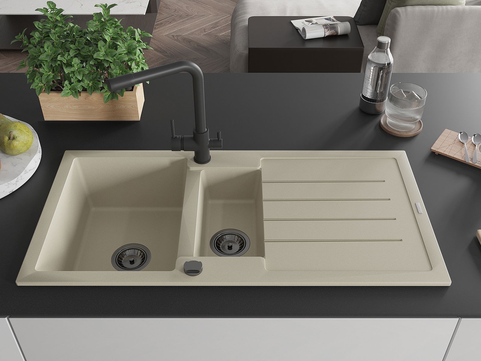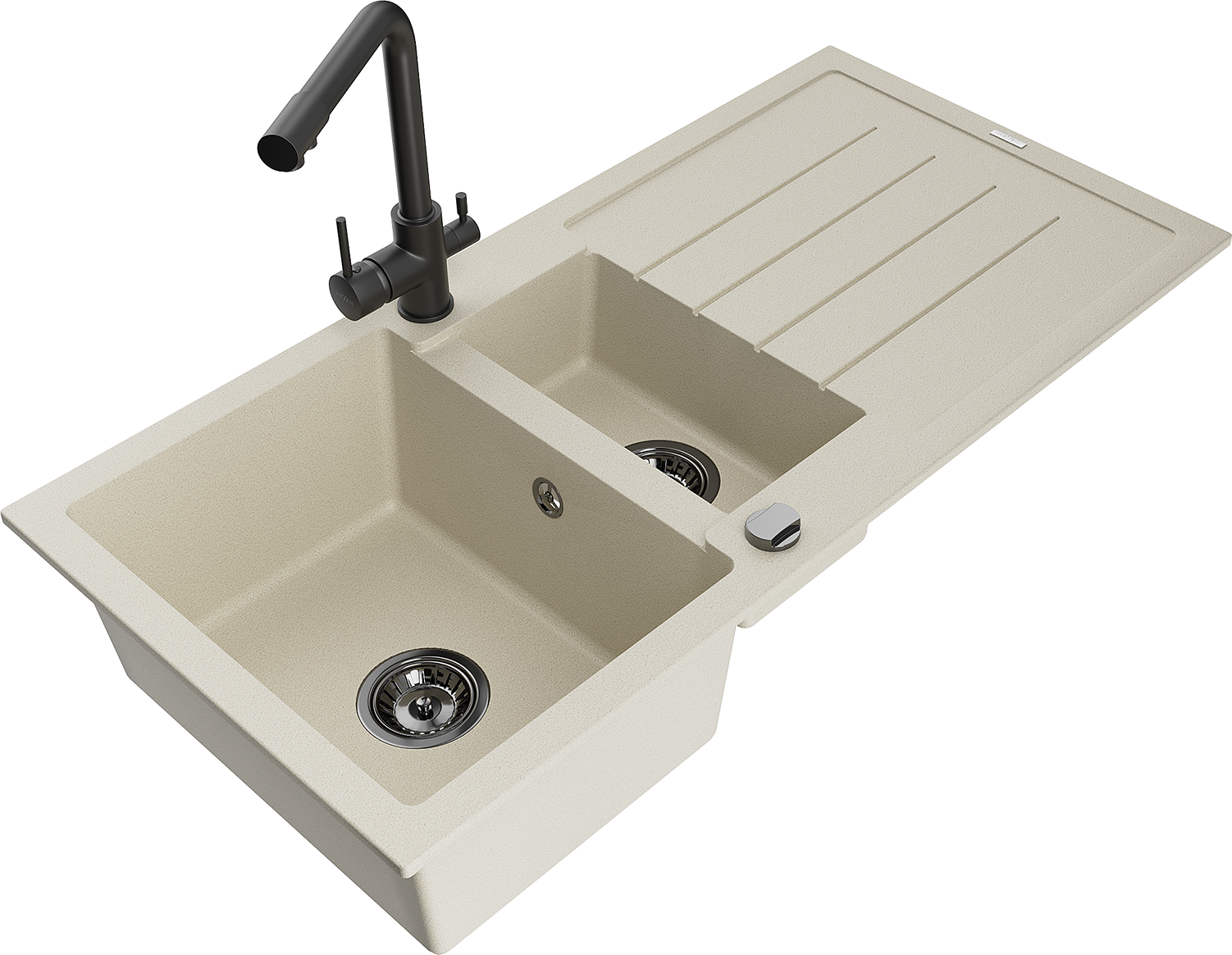Mexen Andres žulový drez 1,5-komorový s odkvapkávačom a kuchynskou batériou Duero, béžový - 6515-69-671600-70