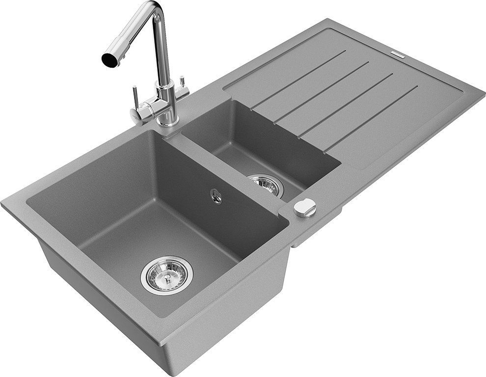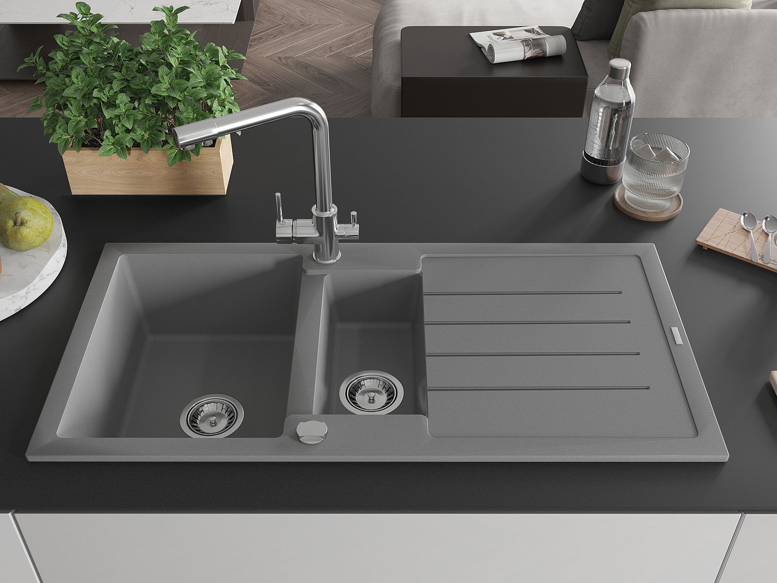 Mexen Andres žulový drez 1,5-komorový s odkvapkávačom a kuchynskou batériou Duero, sivý - 6515-71-671600-00
