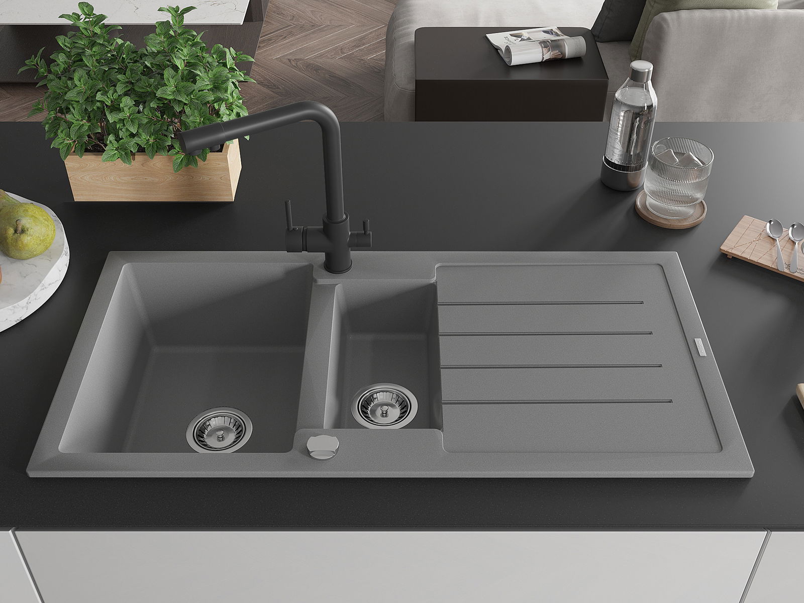 Povrch umývadla je odolný voči škvrnám a sfarbeniu, vďaka čomu sa ľahko čistí a zachováva si svoju farbu po dlhú dobu. Estetický a prakticky dopĺňajúci každú kuchyňu.