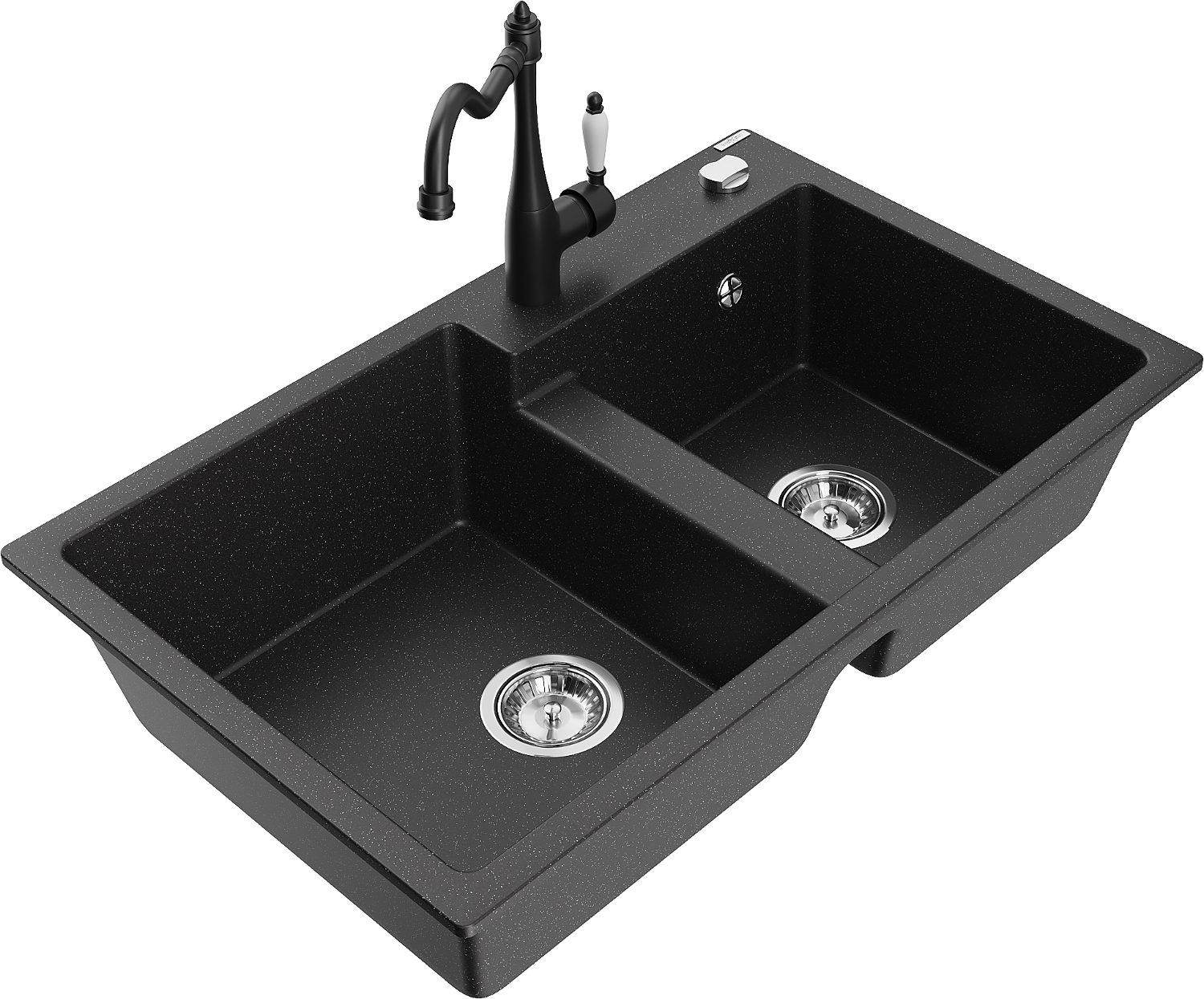 Mexen Tomas granitový drez 2-komorový s kuchynskou batériou Carla, čierny/strieborný metalik - 6516-73-670700-70