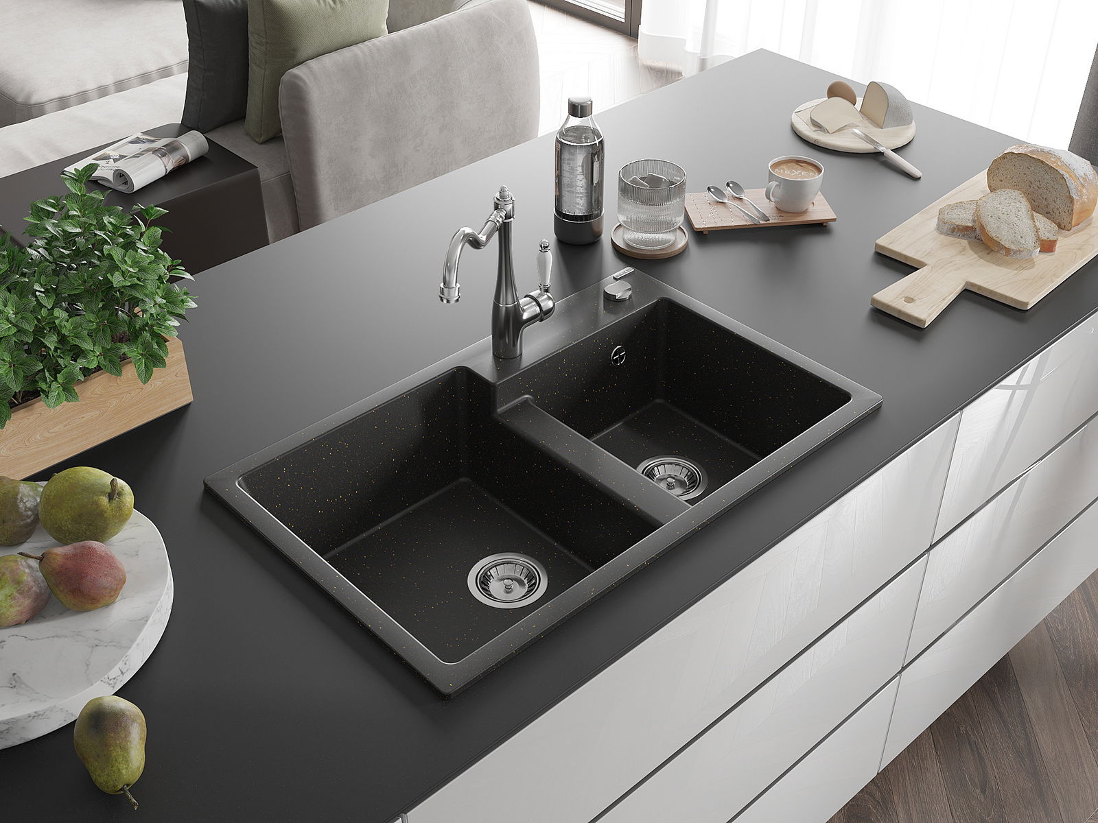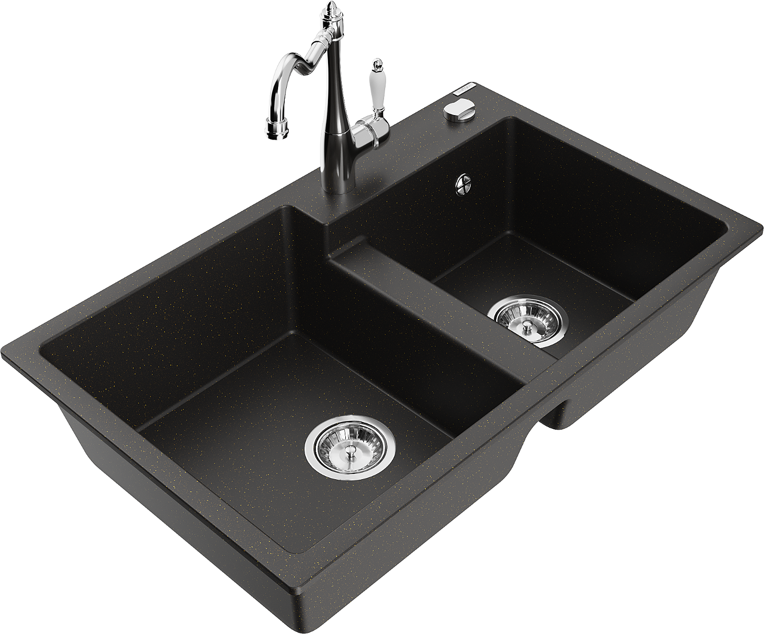 Mexen Tomas žulový drez s 2 komorami a kuchynskou batériou Carla, čierny/zlatý metalický - 6516-75-670700-00