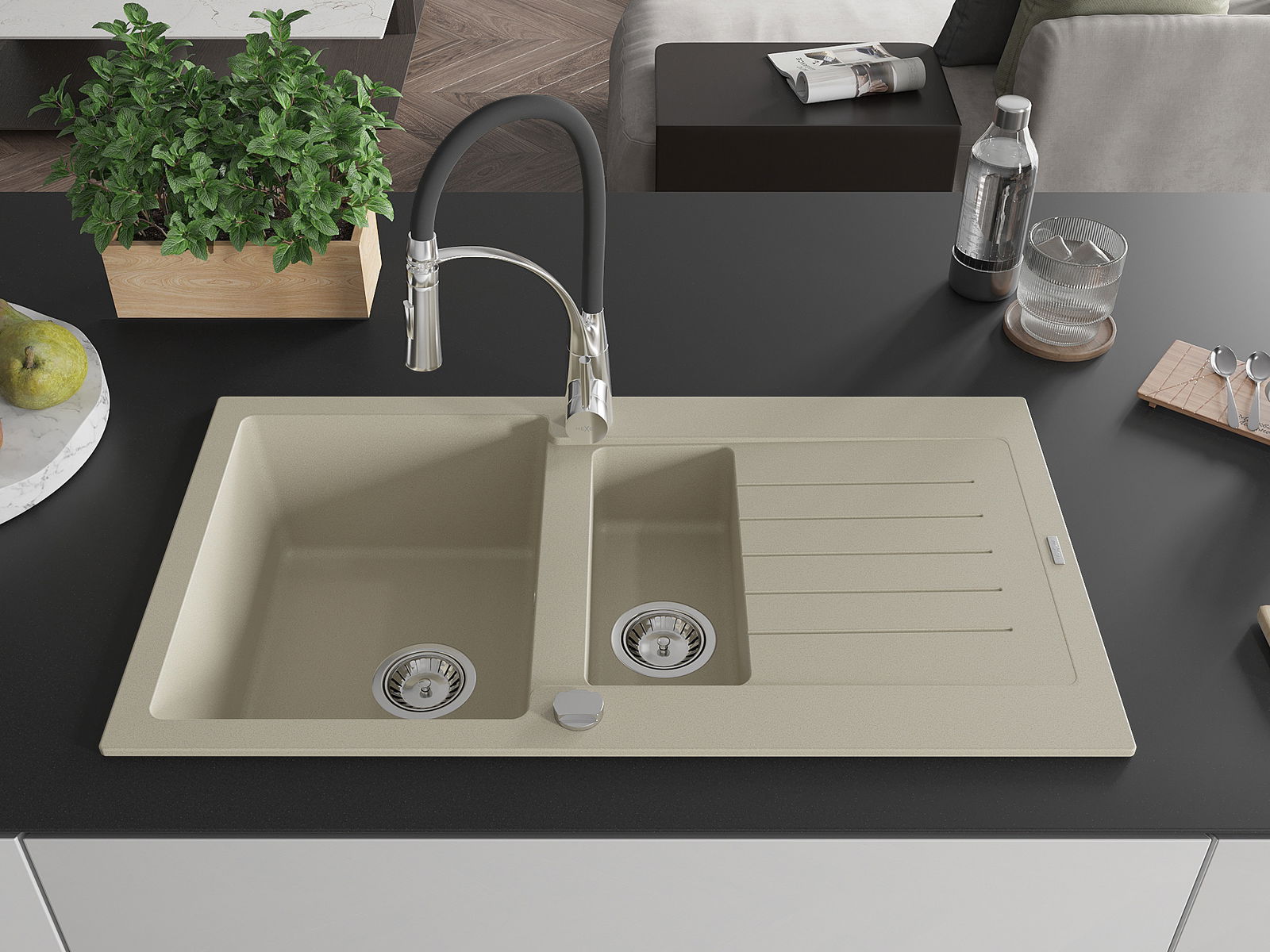 Mexen Matias granitový drez 1,5-komorový s odkvapkávačom a kuchynskou batériou Aster, béžový - 6502-69-73450-07