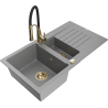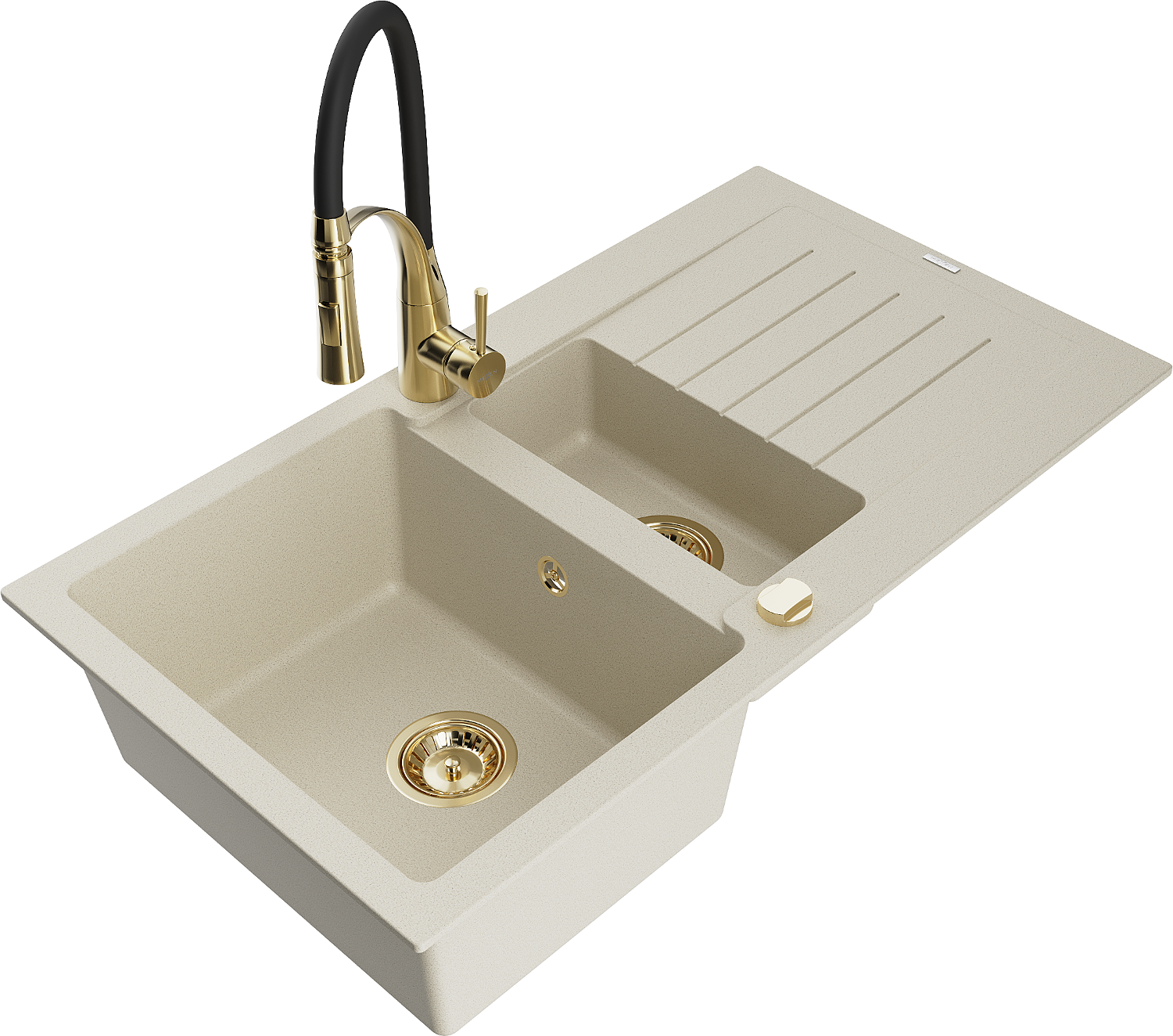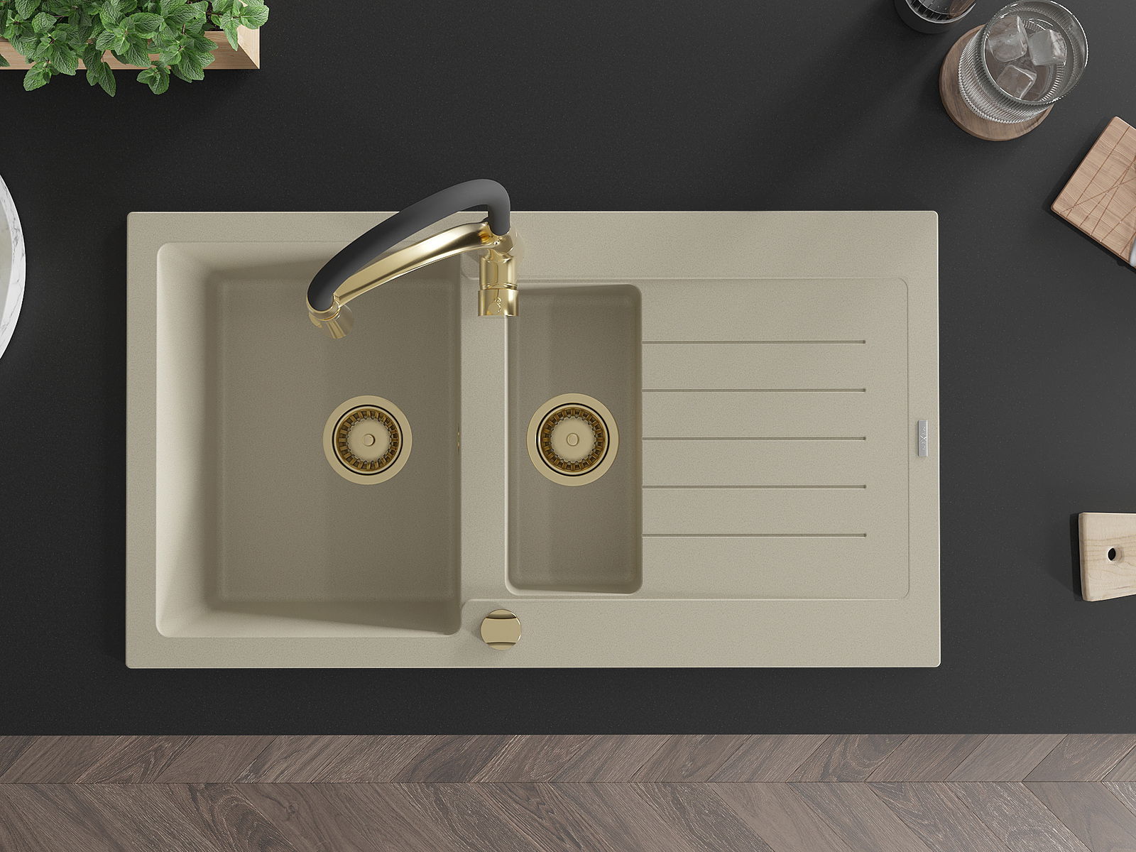 Mexen Matias granitový drez s 1,5 komorami a odkvapkávačom s kuchynskou batériou Aster, béžový - 6502-69-73450-57-G