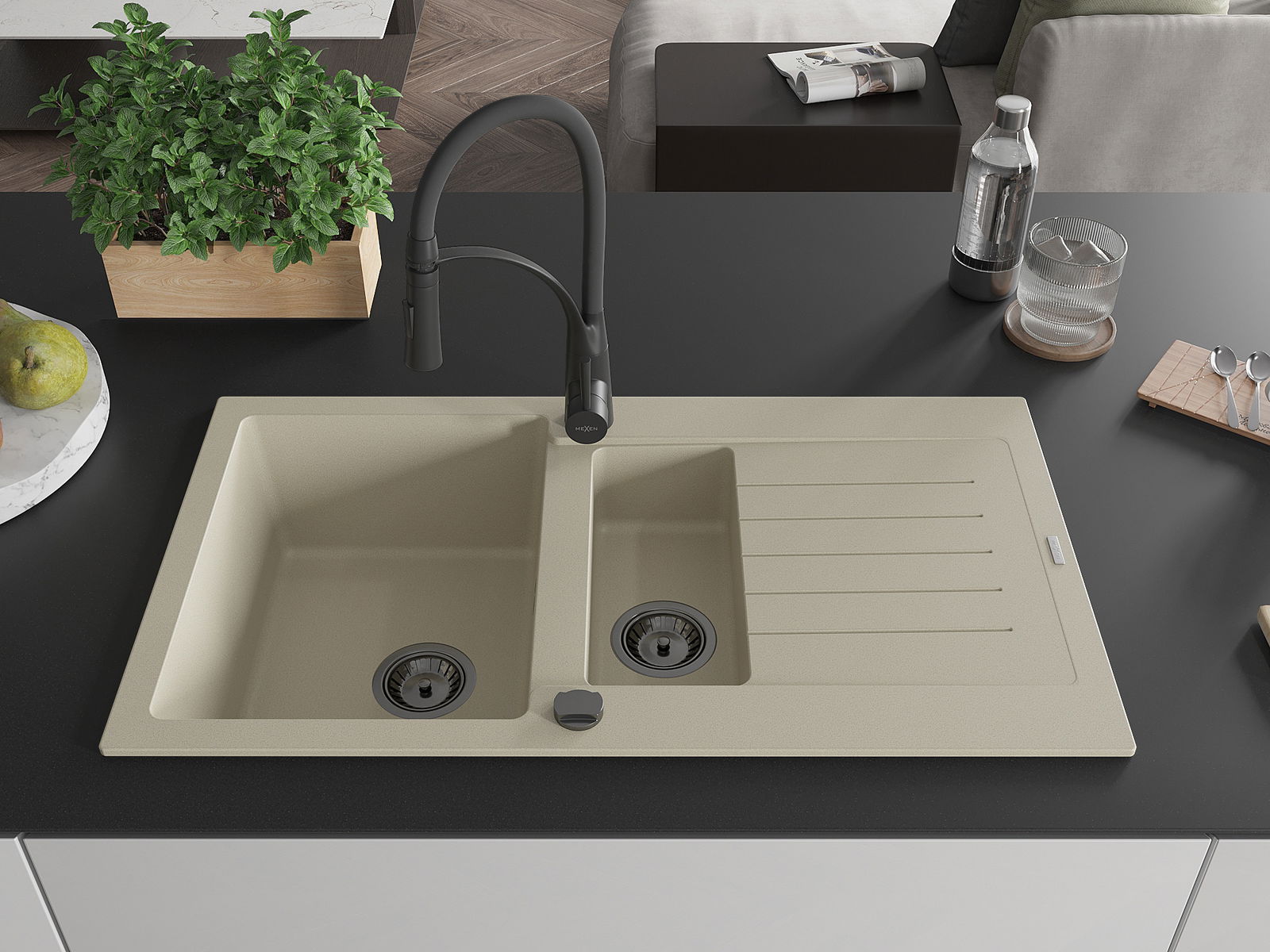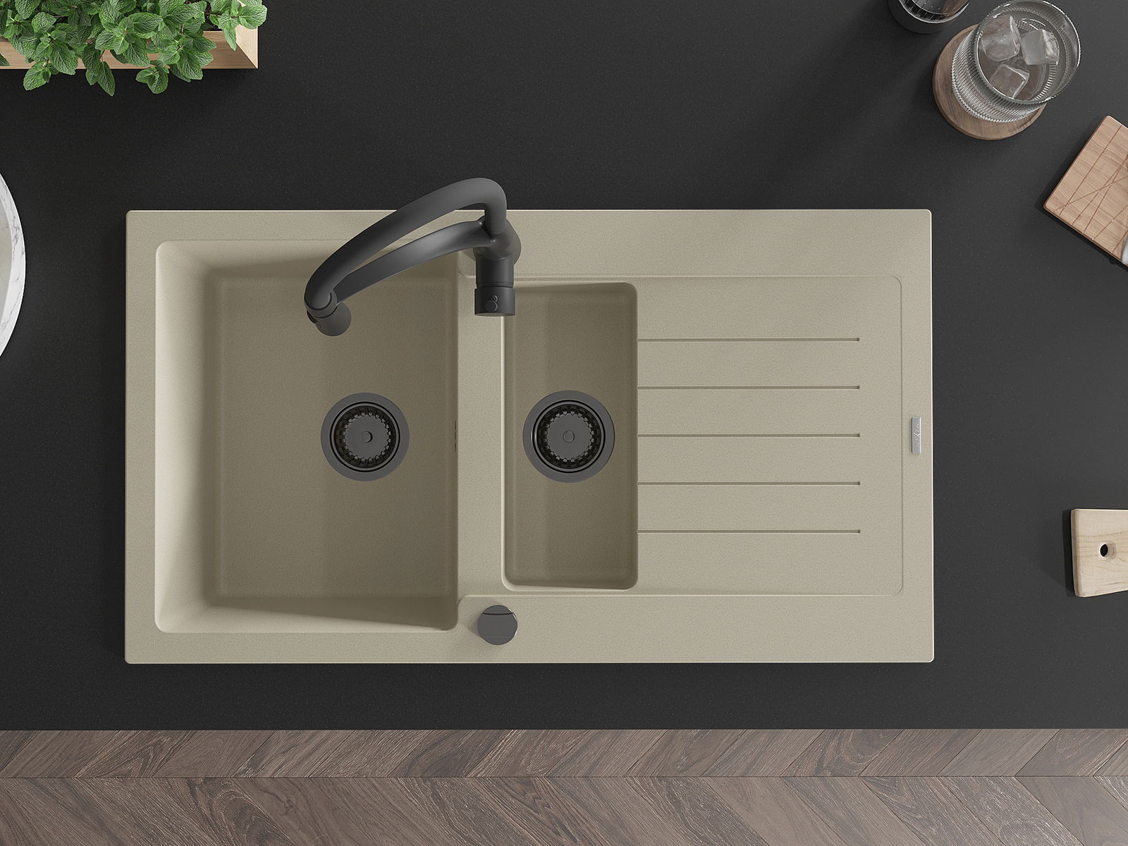 Mexen Matias žulový drez 1,5-komorový s odkvapkávacou plochou a kuchynskou batériou Aster, béžový - 6502-69-73450-70-B