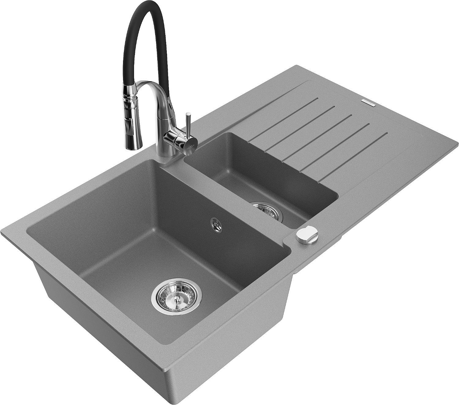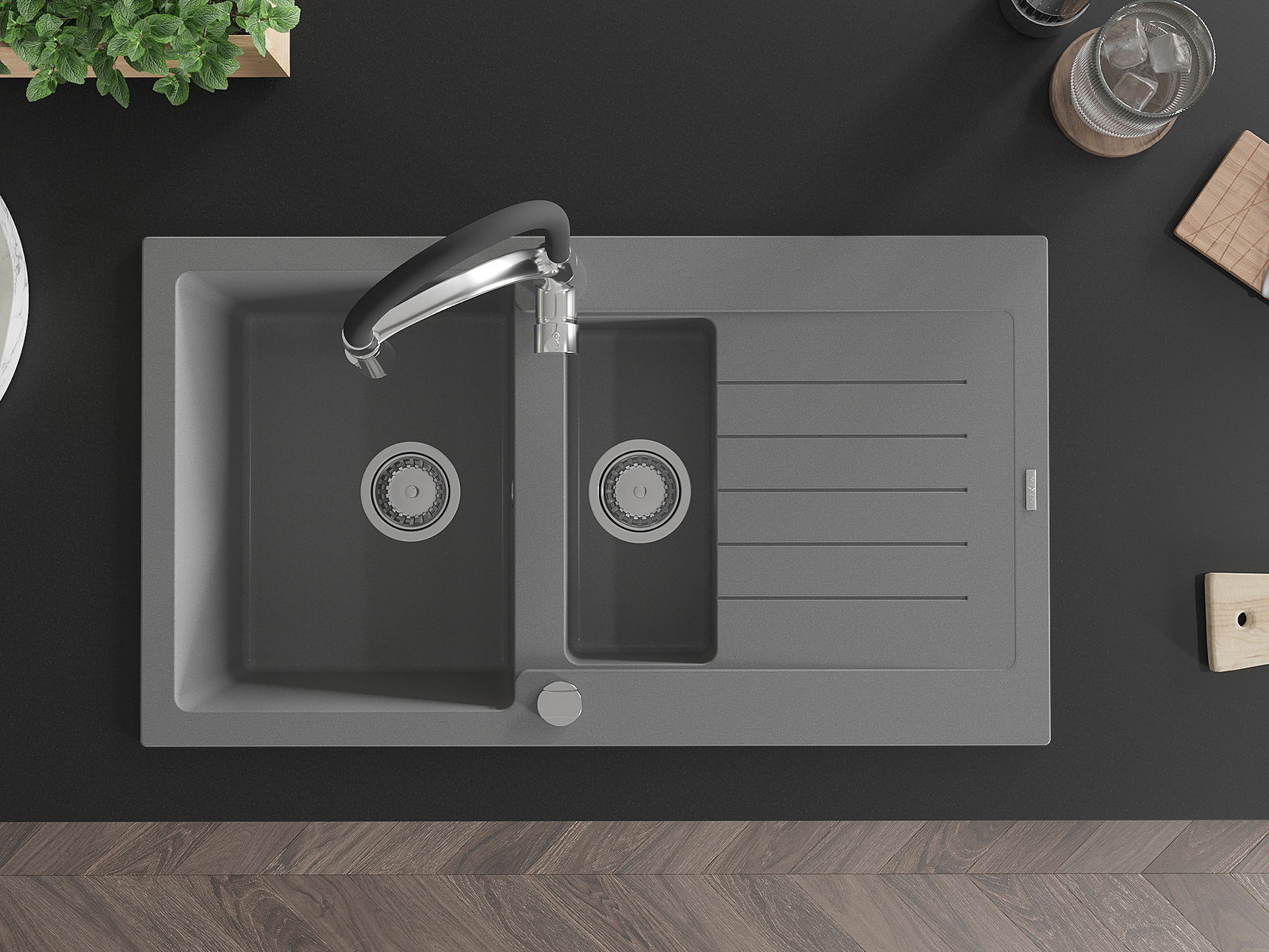 Mexen Matias granitový drez 1,5-komorový s odkvapkávačom a kuchynskou batériou Aster, sivý - 6502-71-73450-07