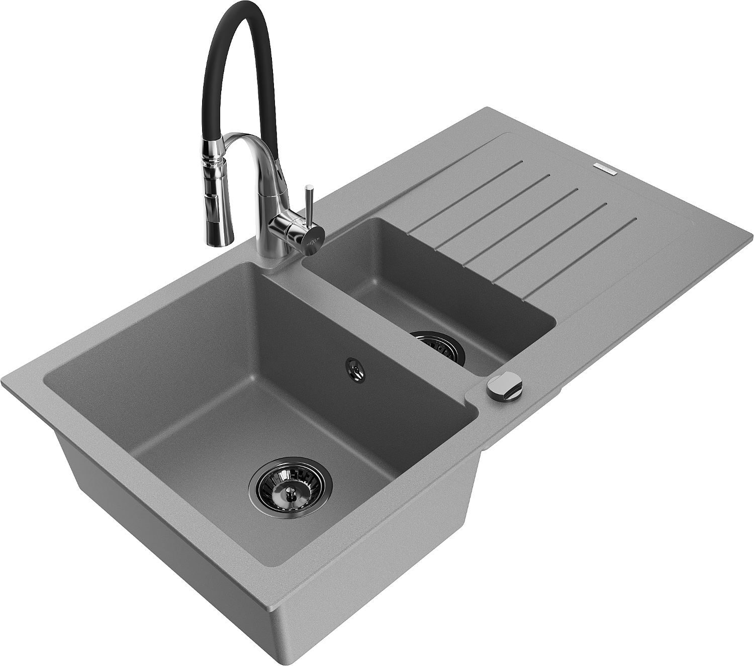 Mexen Matias granitový drez 1,5-komorový s odkvapkávačom a kuchynskou batériou Aster, sivý - 6502-71-73450-07-B