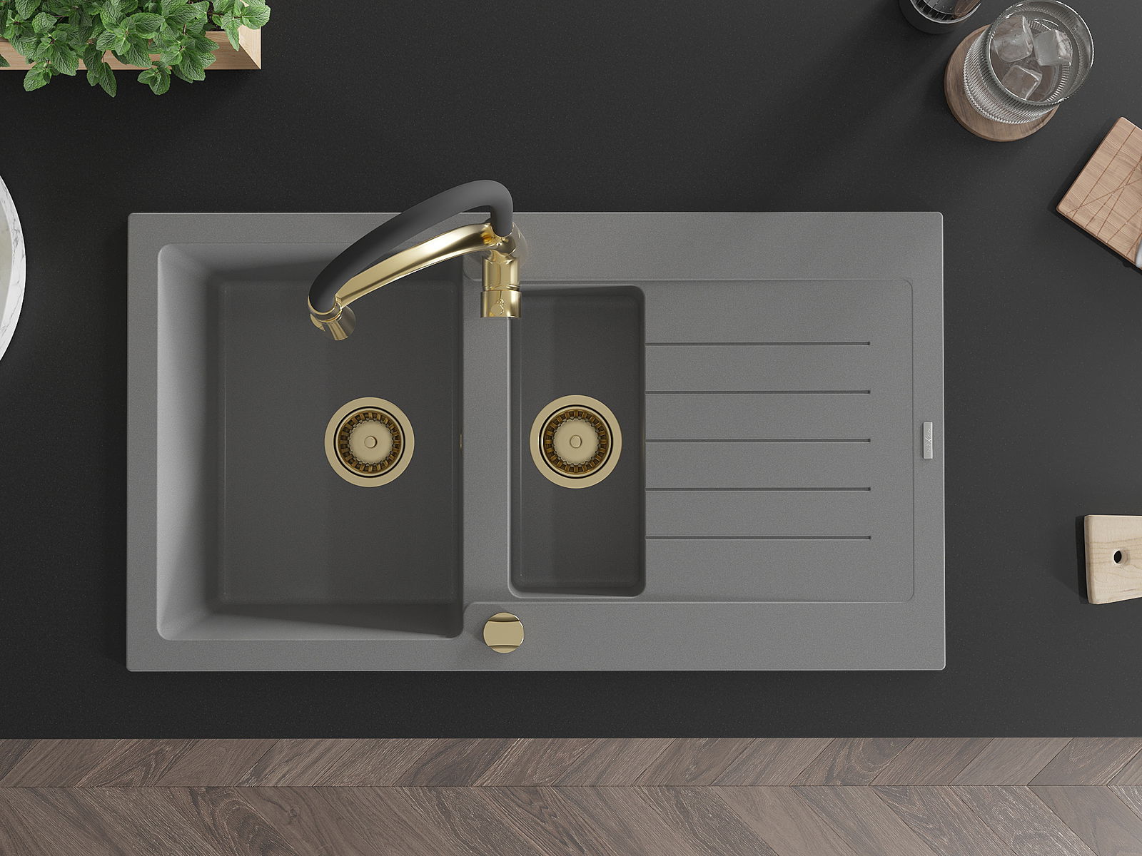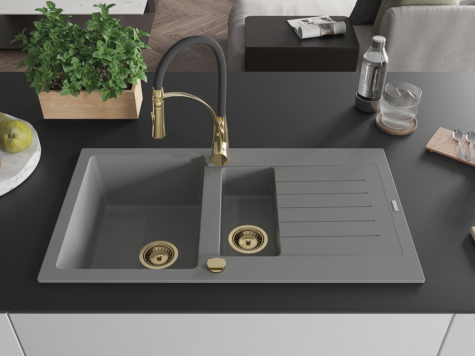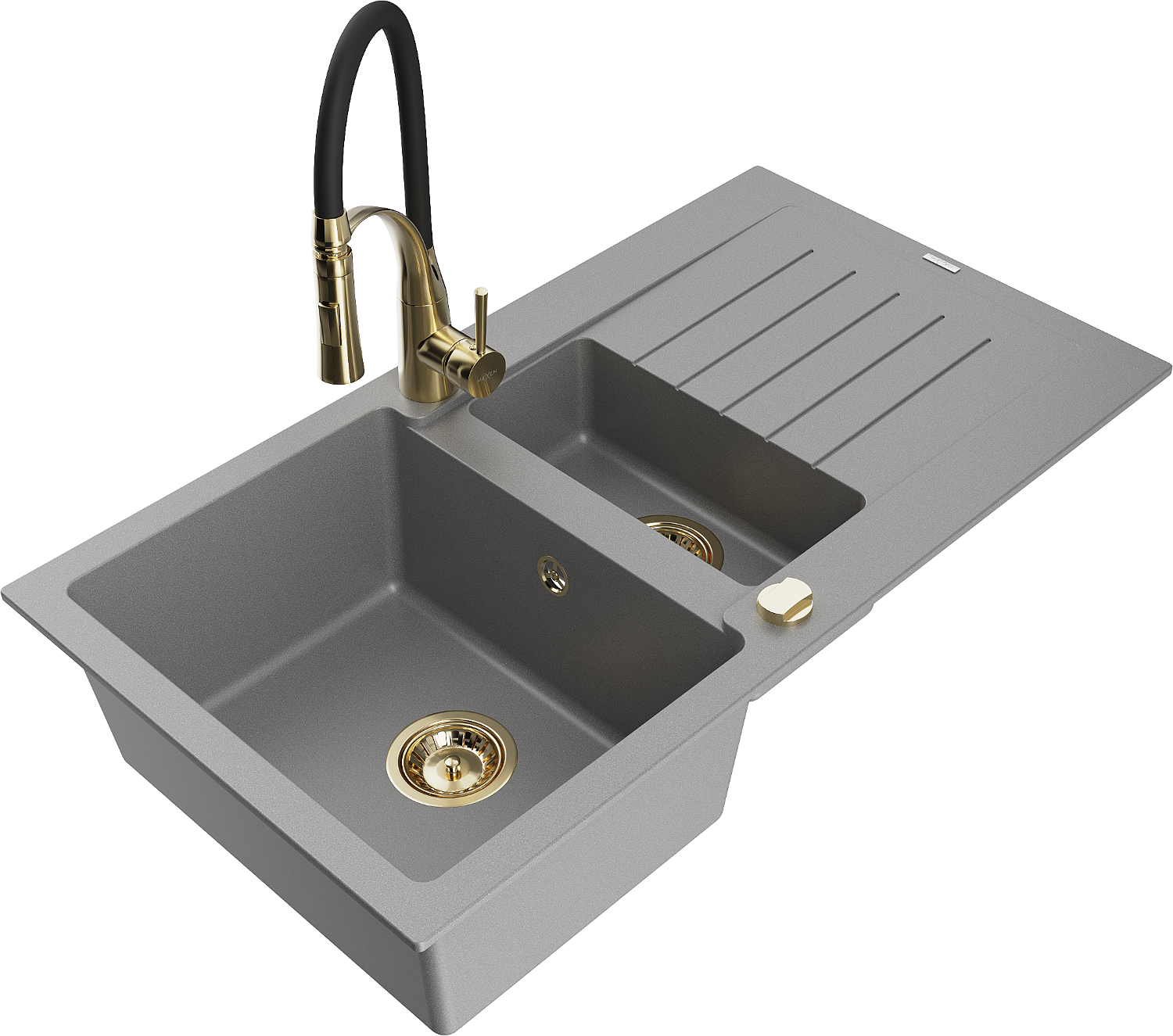 Mexen Matias žulový drez 1,5-komorový s odkvapkávačom a kuchynskou batériou Aster, sivý - 6502-71-73450-57-G