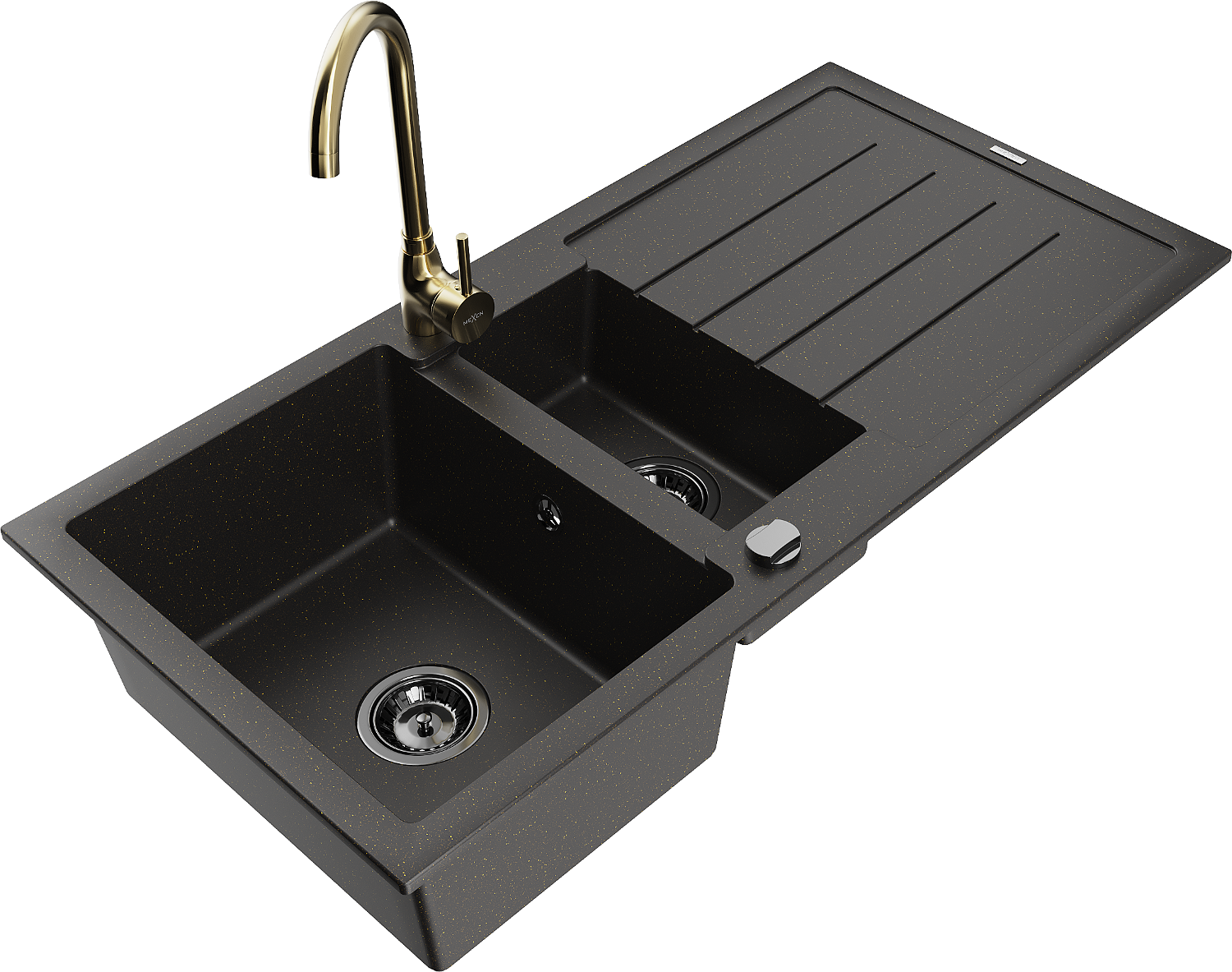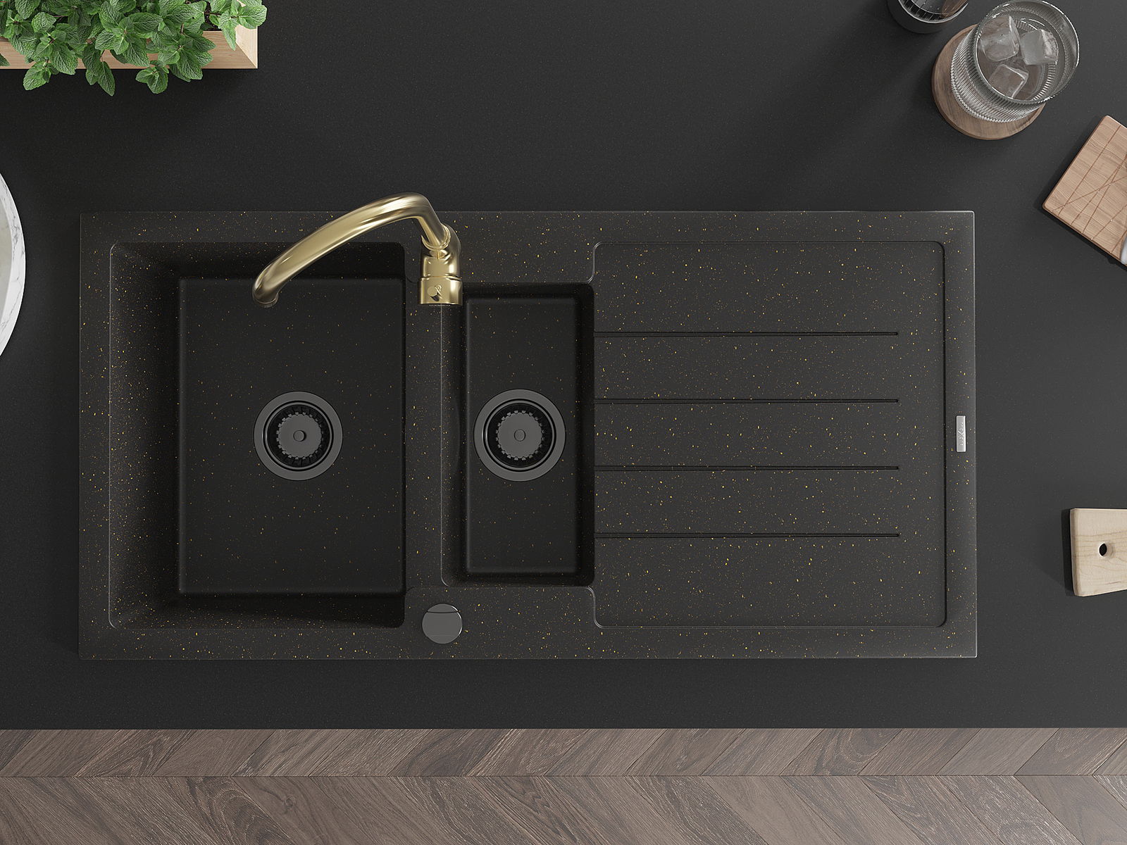 Mexen Andres granitový kuchynský drez 1,5-komorový s odkvapkávacou plochou a kuchynskou batériou Telma, čierny/zlatý - 6515-75-?