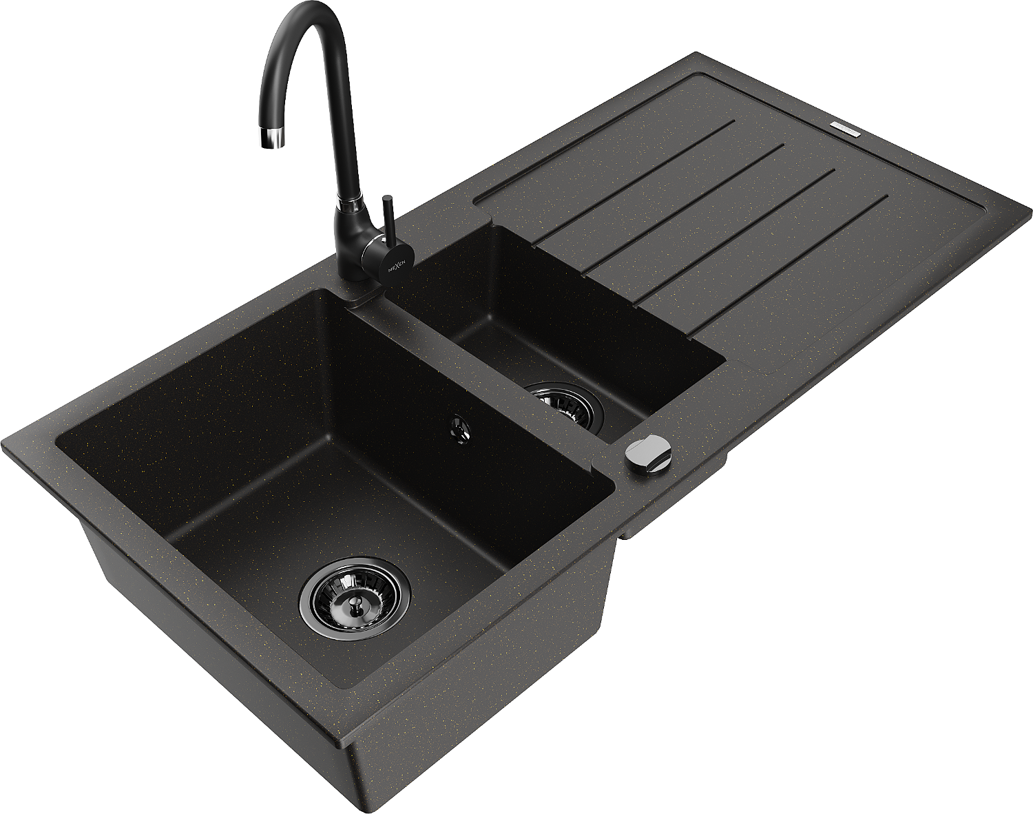 Mexen Andres žulový drez 1,5-komorový s odkvapkávačom a kuchynskou batériou Telma, čierny/zlatý - 6515-75-670200-70-B