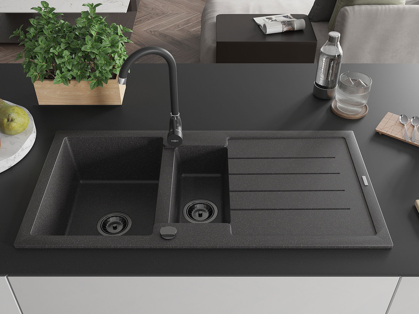 Povrch kuchynského drezu je odolný voči škvrnám a zafarbeniu, vďaka čomu sa ľahko udržiava a zachováva svoju farbu počas dlhého obdobia používania. Estetický a praktický doplnok pre každú kuchyňu.