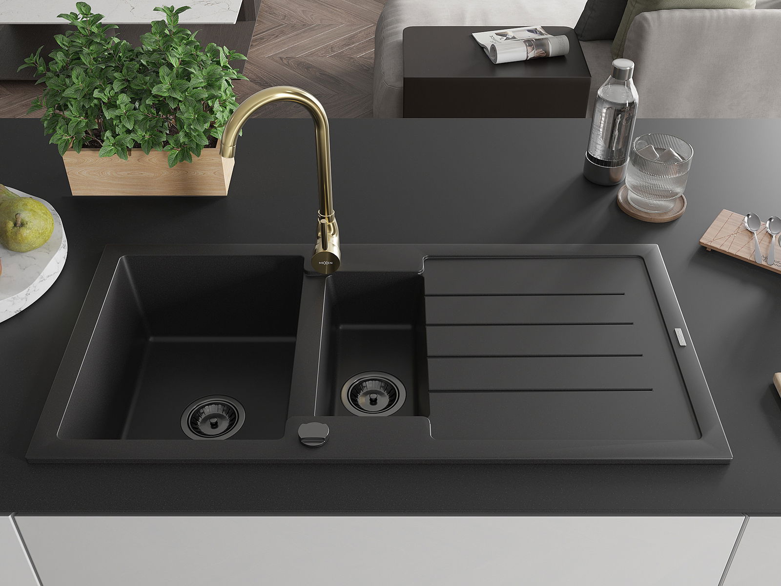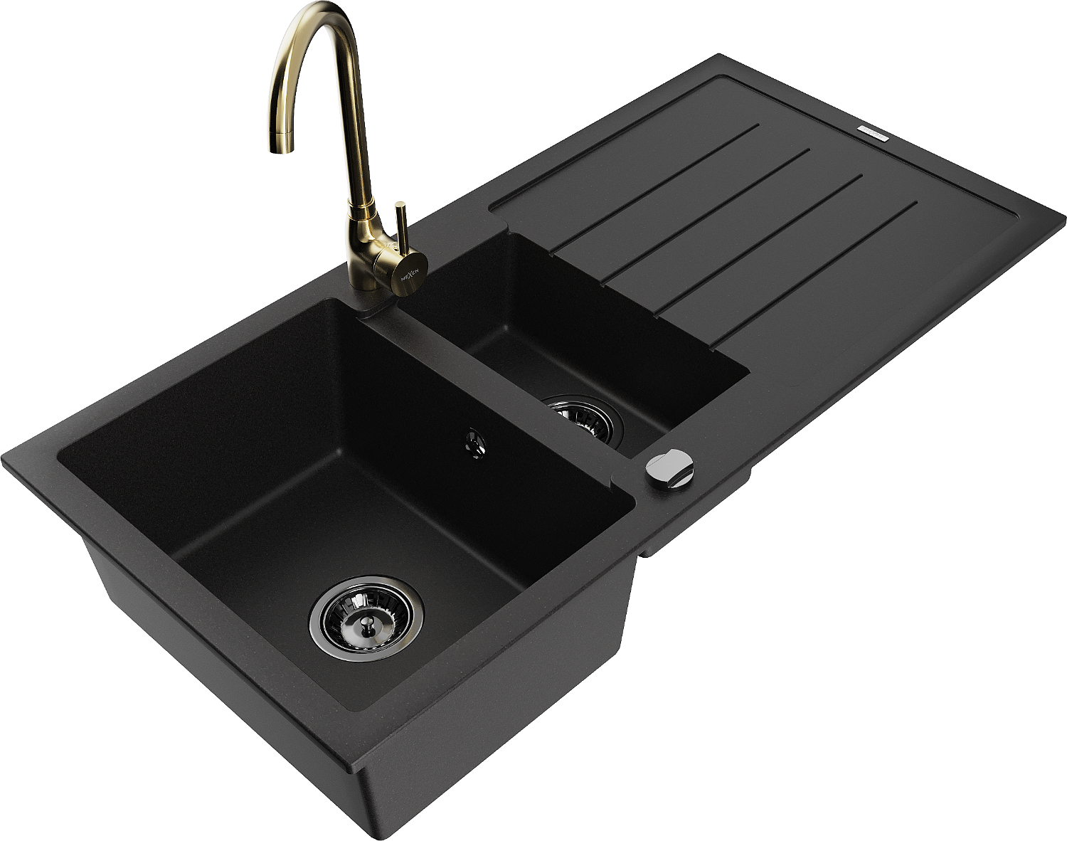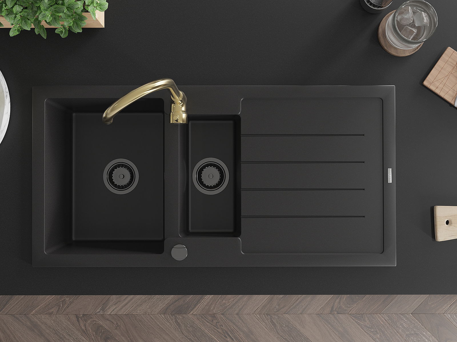 Mexen Andres žulový drez 1,5-komorový s odkvapkávačom a kuchynskou batériou Telma, čierny - 6515-77-670200-50-B