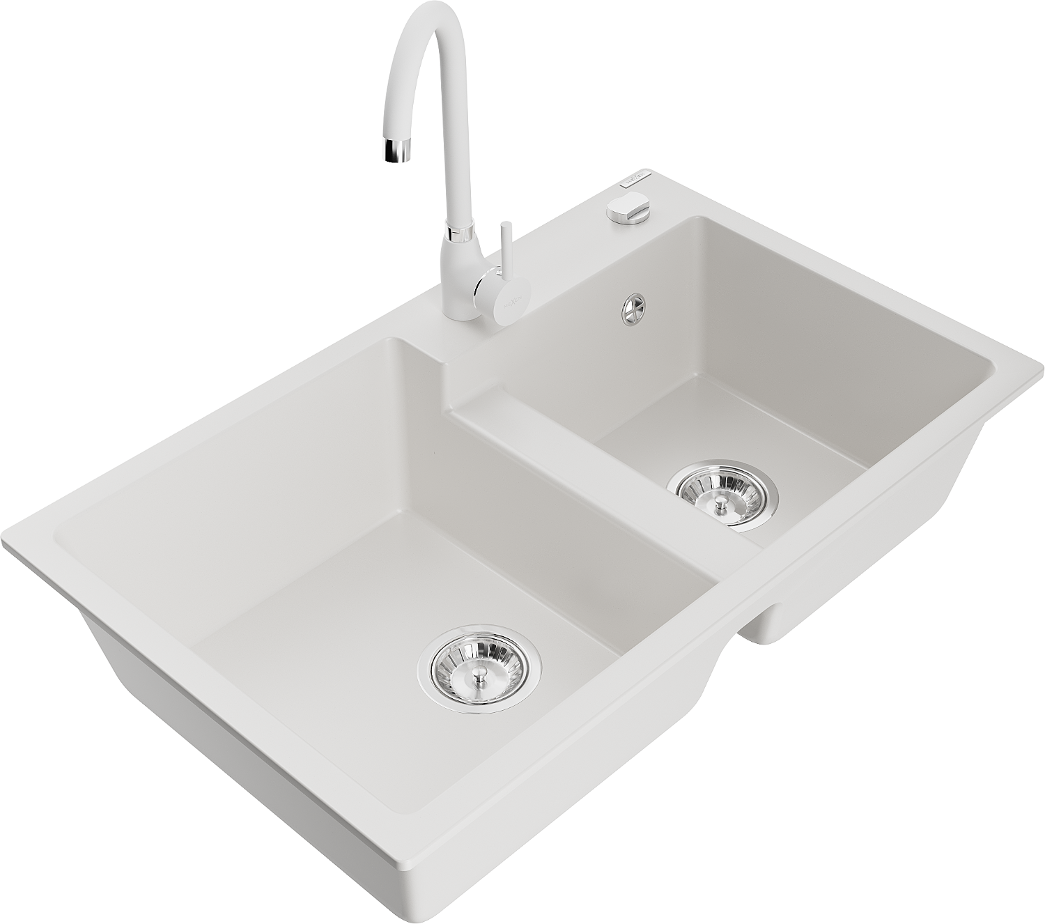 Mexen Tomas žulový drez 2-komorový s kuchynskou batériou Telma, biely - 6516-20-670200-20