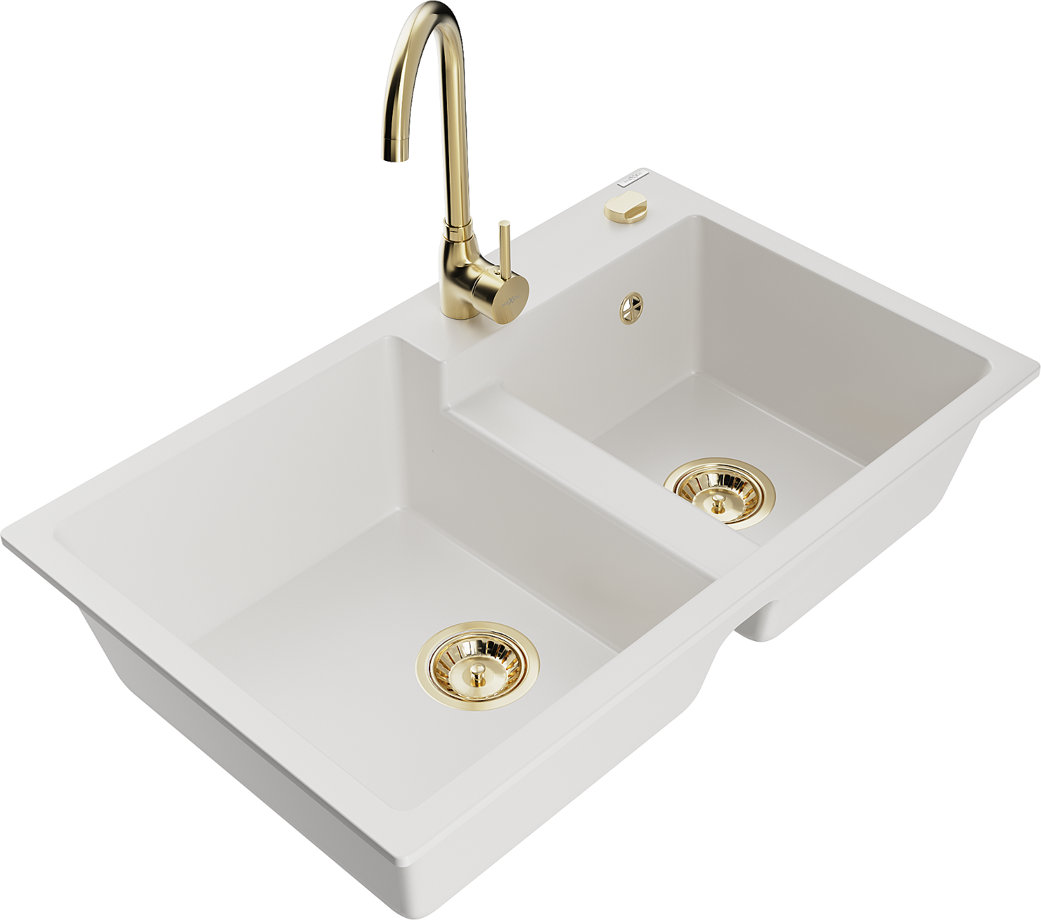 Mexen Tomas granitový kuchynský drez 2-komorový s kuchynskou batériou Telma, biely - 6516-20-670200-50
