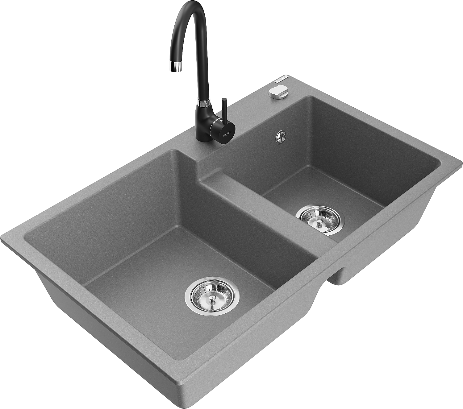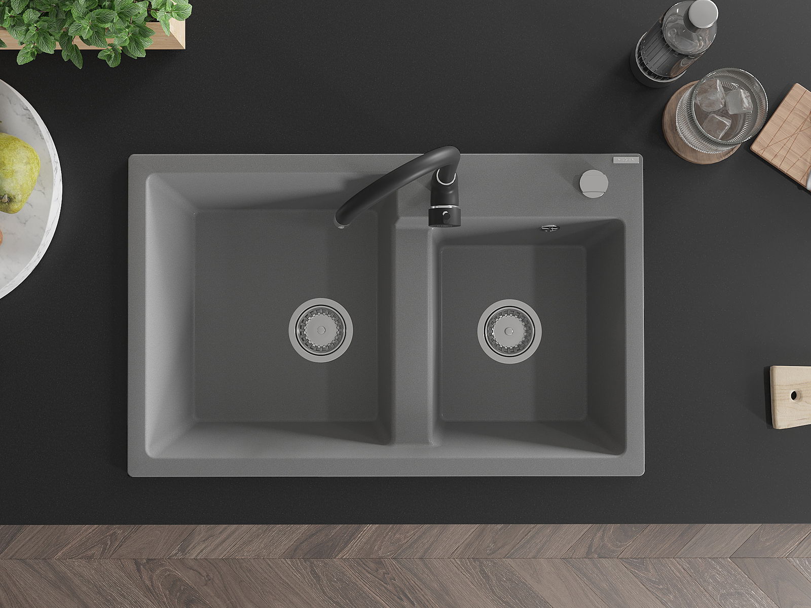 Mexen Tomas žulový drez 2-komorový s kuchynskou batériou Telma, sivý - 6516-71-670200-70