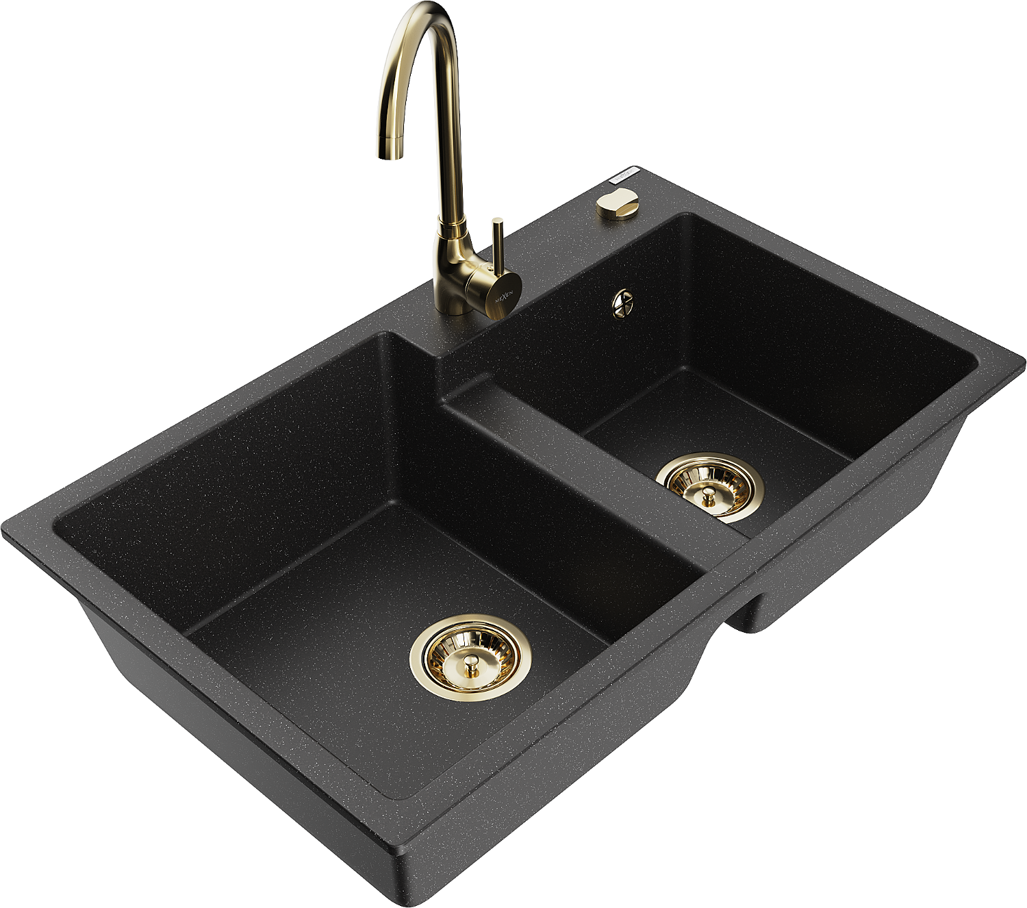 Mexen Tomas granitový drez, dvojkomorový, s kuchynskou batériou Telma, čierny/strieborný metalický - 6516-73-670200-50