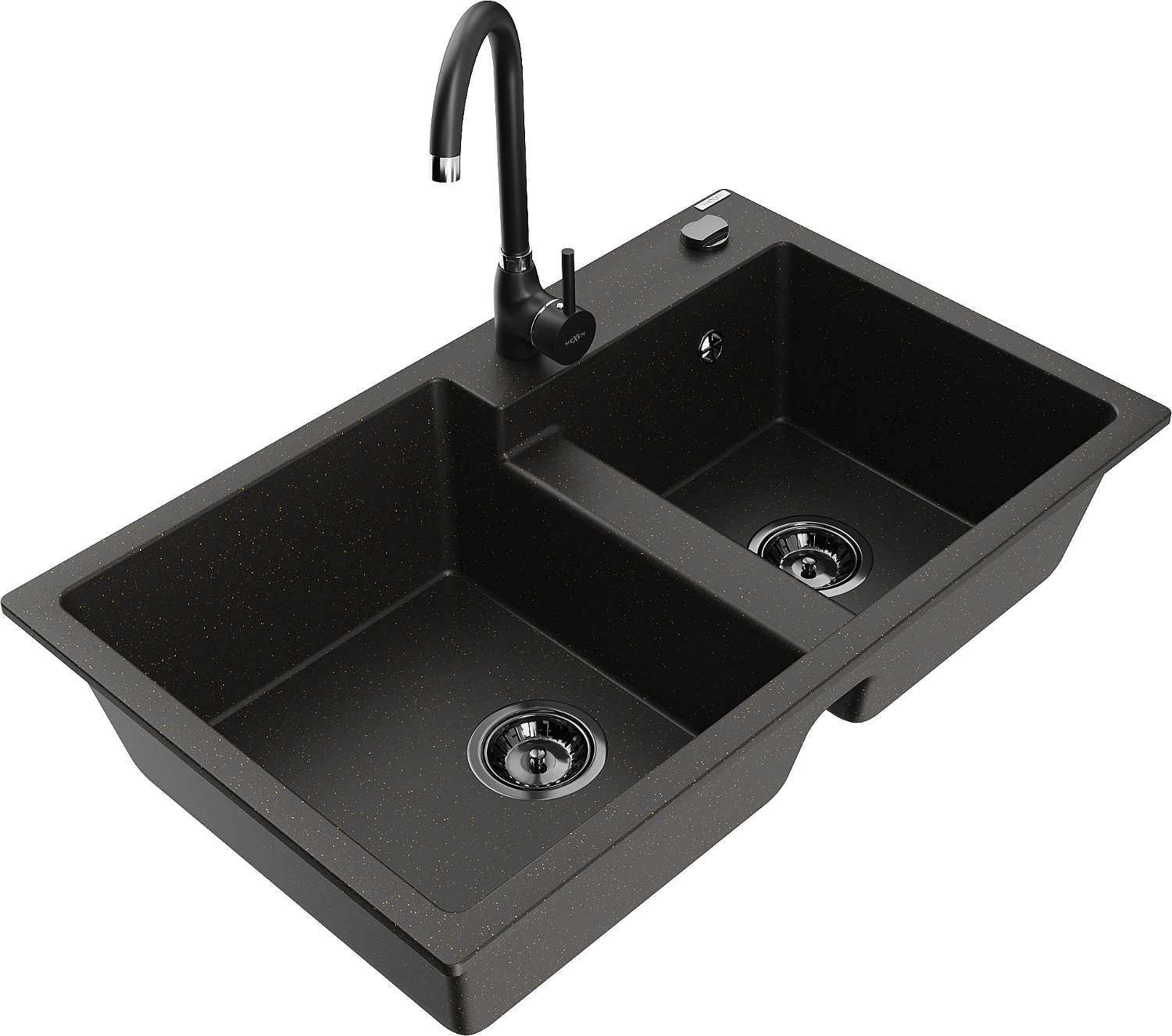 Mexen Tomas žulový dvojkomorový kuchynský drez s kuchynskou batériou Telma, čierny/zlatý metalický - 6516-75-670200-70-B