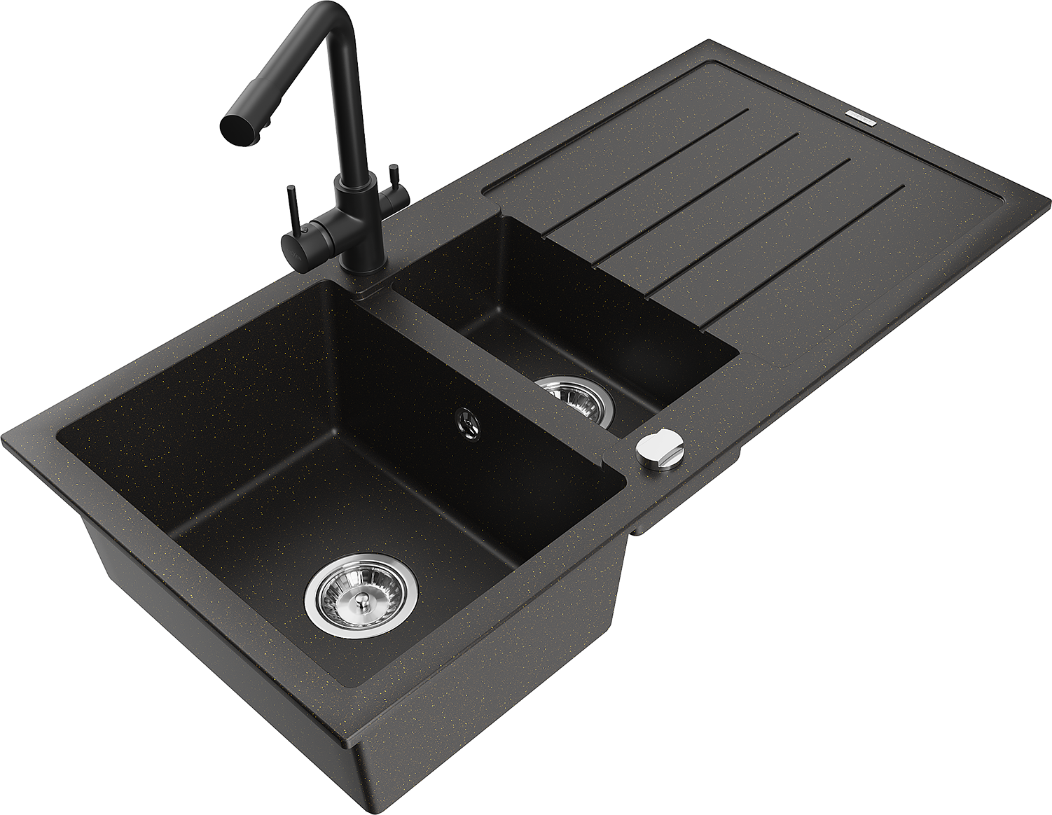 Mexen Andres žulový drez 1,5-komorový s odkvapkávačom a kuchynskou batériou Duero, čierny/zlatý - 6515-75-671600-70