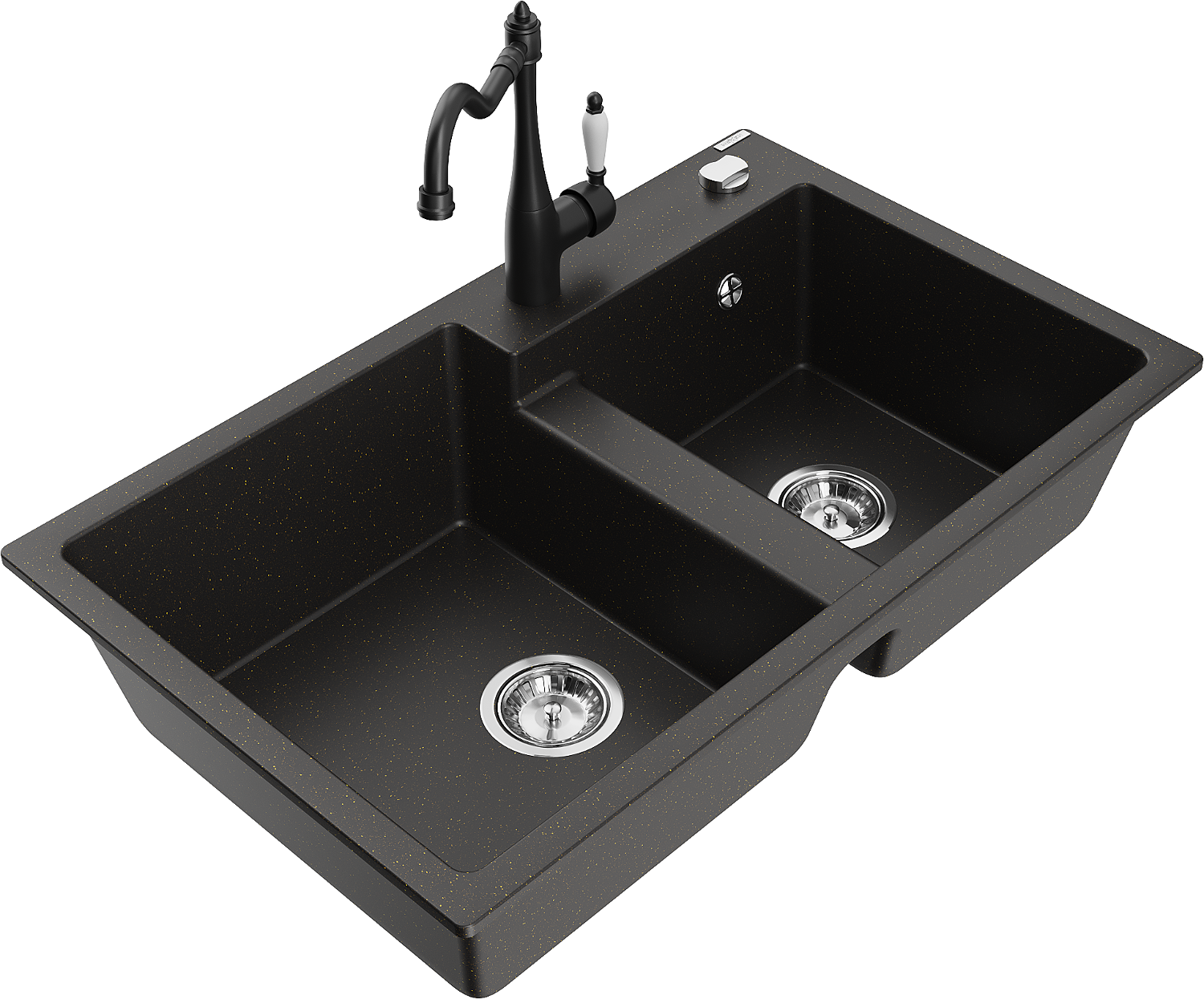 Mexen Tomas granitový drez 2-komorový s kuchynskou batériou Carla, čierno/zlatý metalik - 6516-75-670700-70