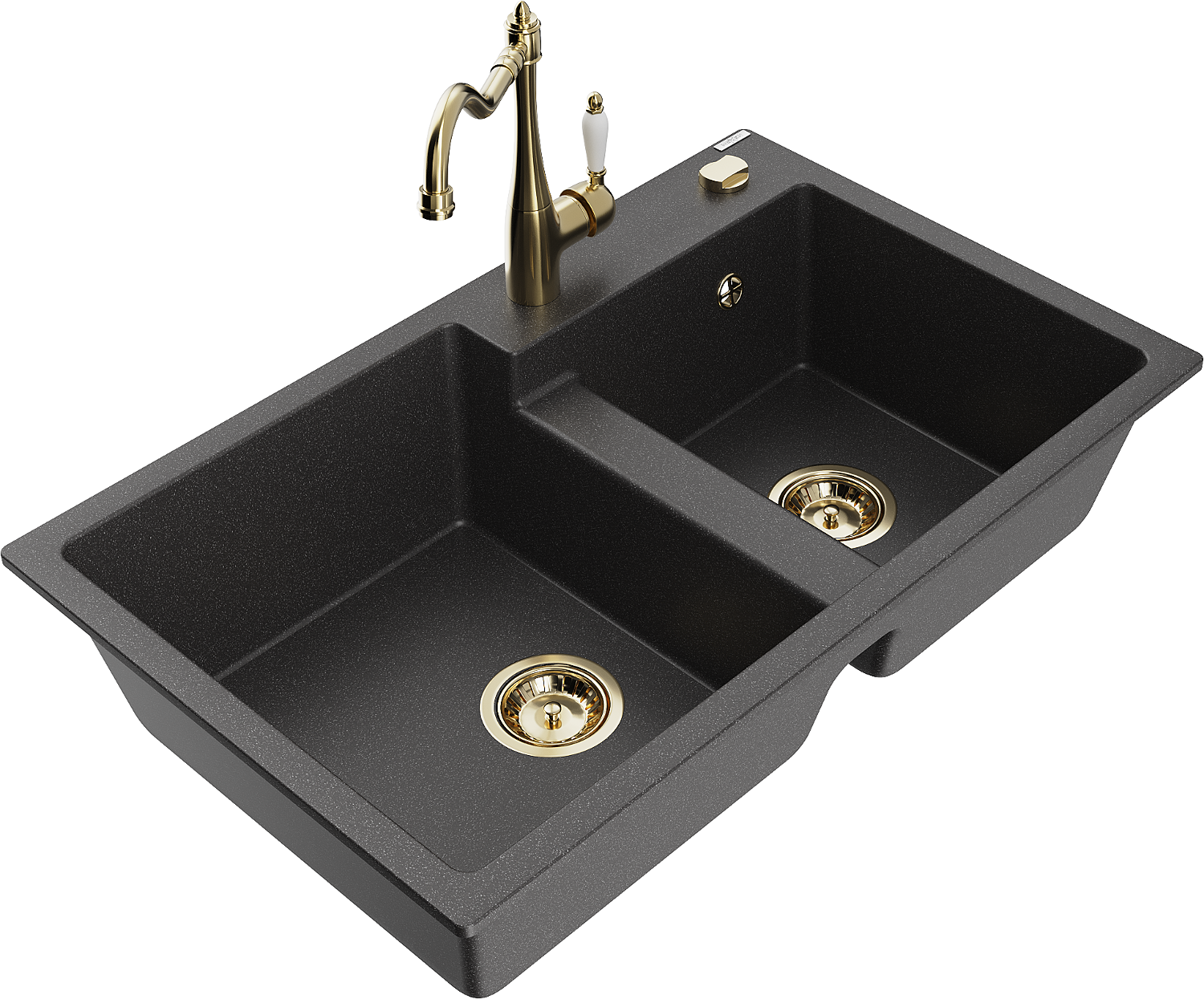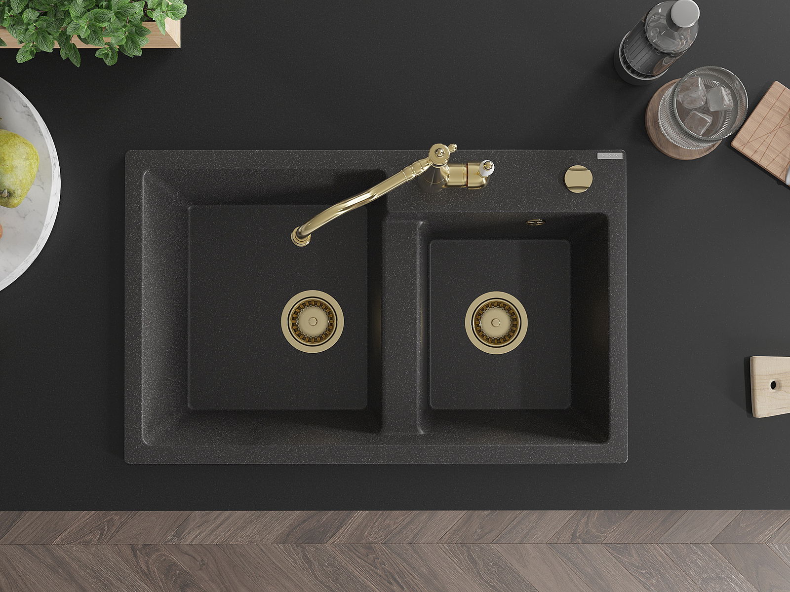 Mexen Tomas žulový drez 2-komorový s kuchynskou batériou Carla, čierny melír - 6516-76-670700-50