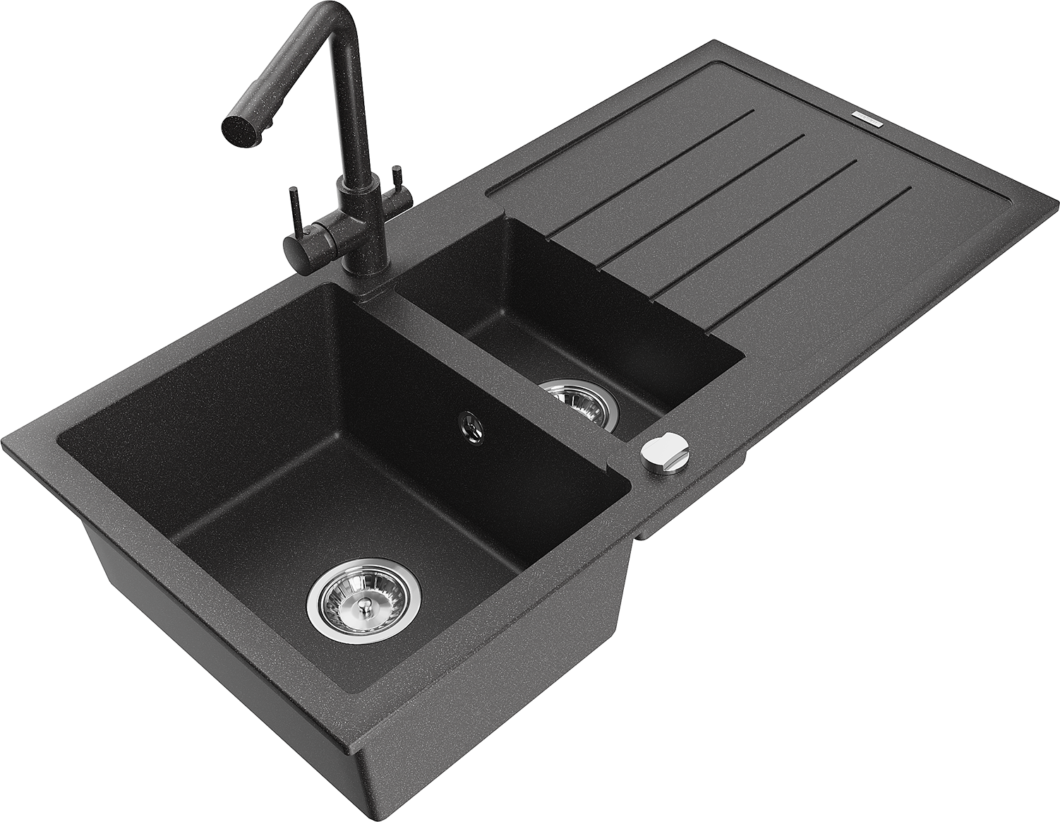 Mexen Andres žulový drez 1,5-komorový s odkvapkávačom a kuchynskou batériou Duero, čierny s fľakmi - 6515-76-671600-76