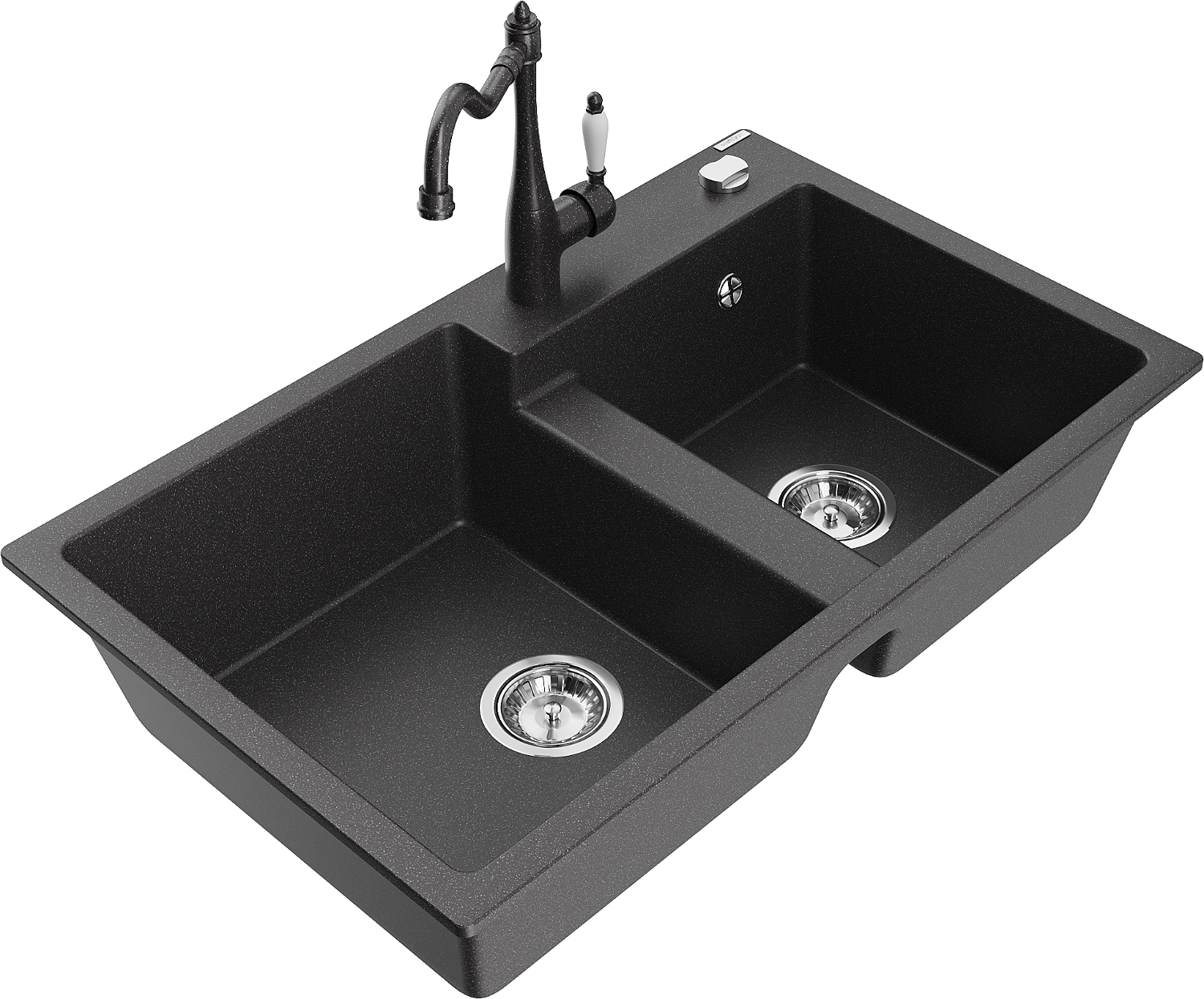 Mexen Tomas dvojkomorový žulový drez s kuchynskou batériou Carla, čierny škvrnitý - 6516-76-670700-76