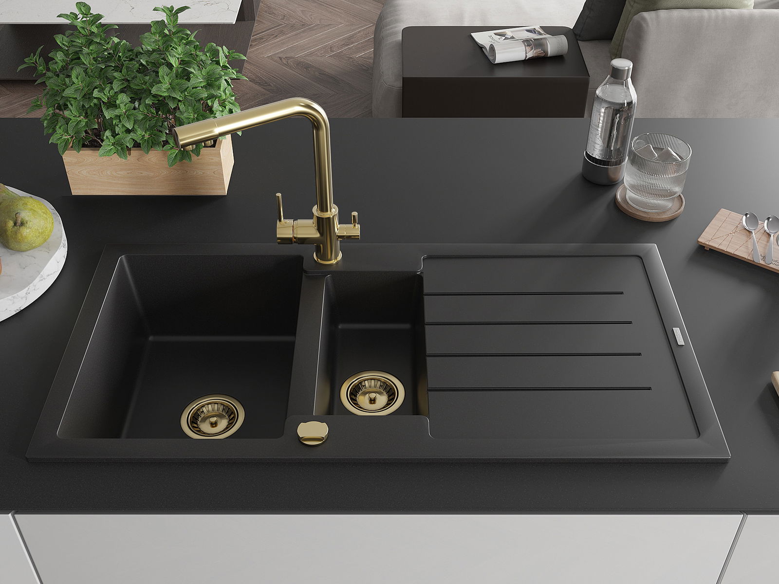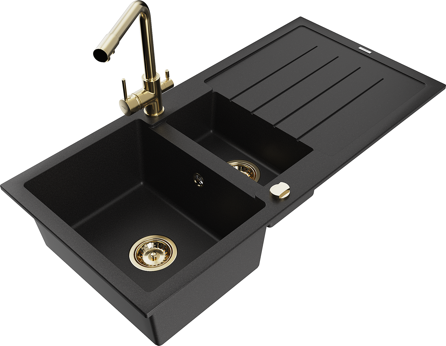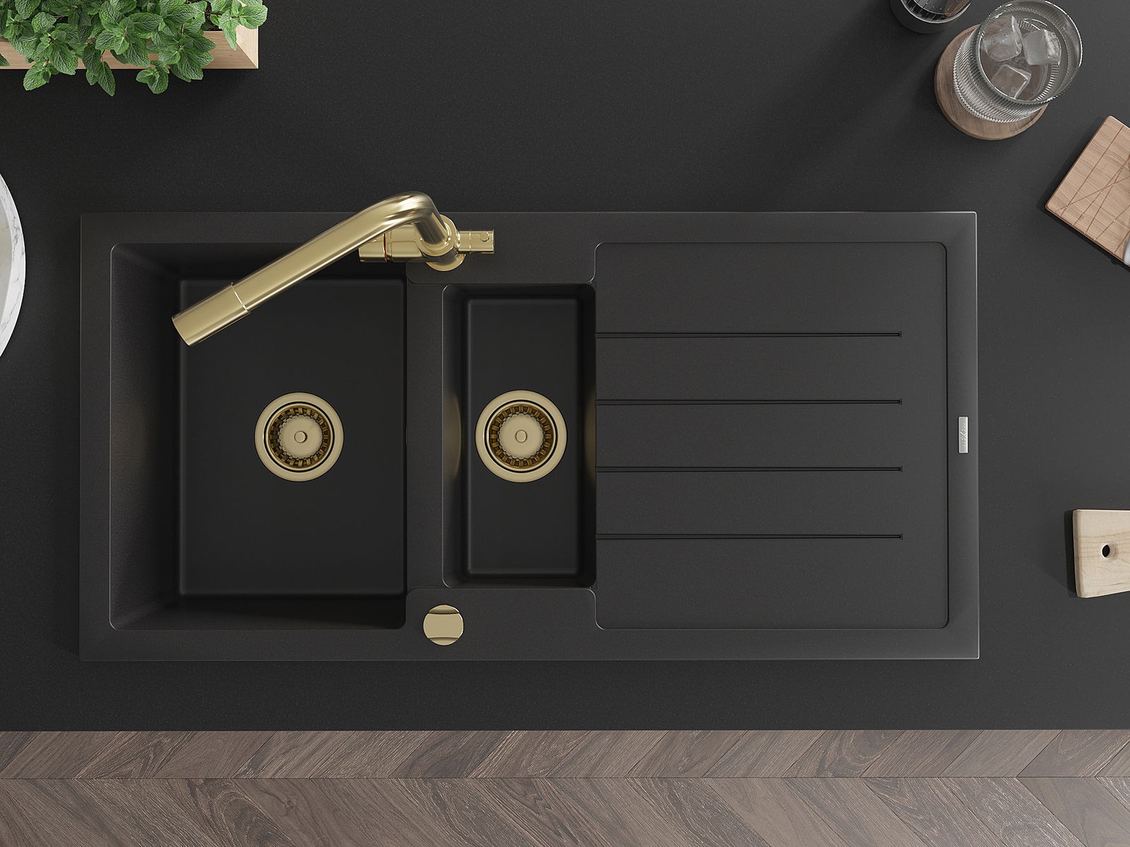 Mexen Andres granitový drez 1,5-komorový s odkvapkávačom a kuchynskou batériou Duero, čierny - 6515-77-671600-50