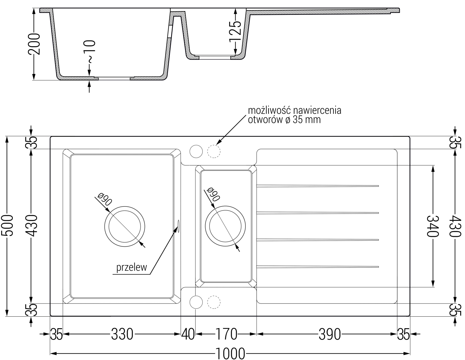 Drez má 2 predfrézované otvory s priemerom 35 mm, ktoré si môžete vlastnoručne vyraziť. Môžete ich využiť napríklad na montáž dávkovača na tekutinu, ktorý eliminuje prítomnosť plastových fliaš v kuchyni a dodá jej elegantný vzhľad.