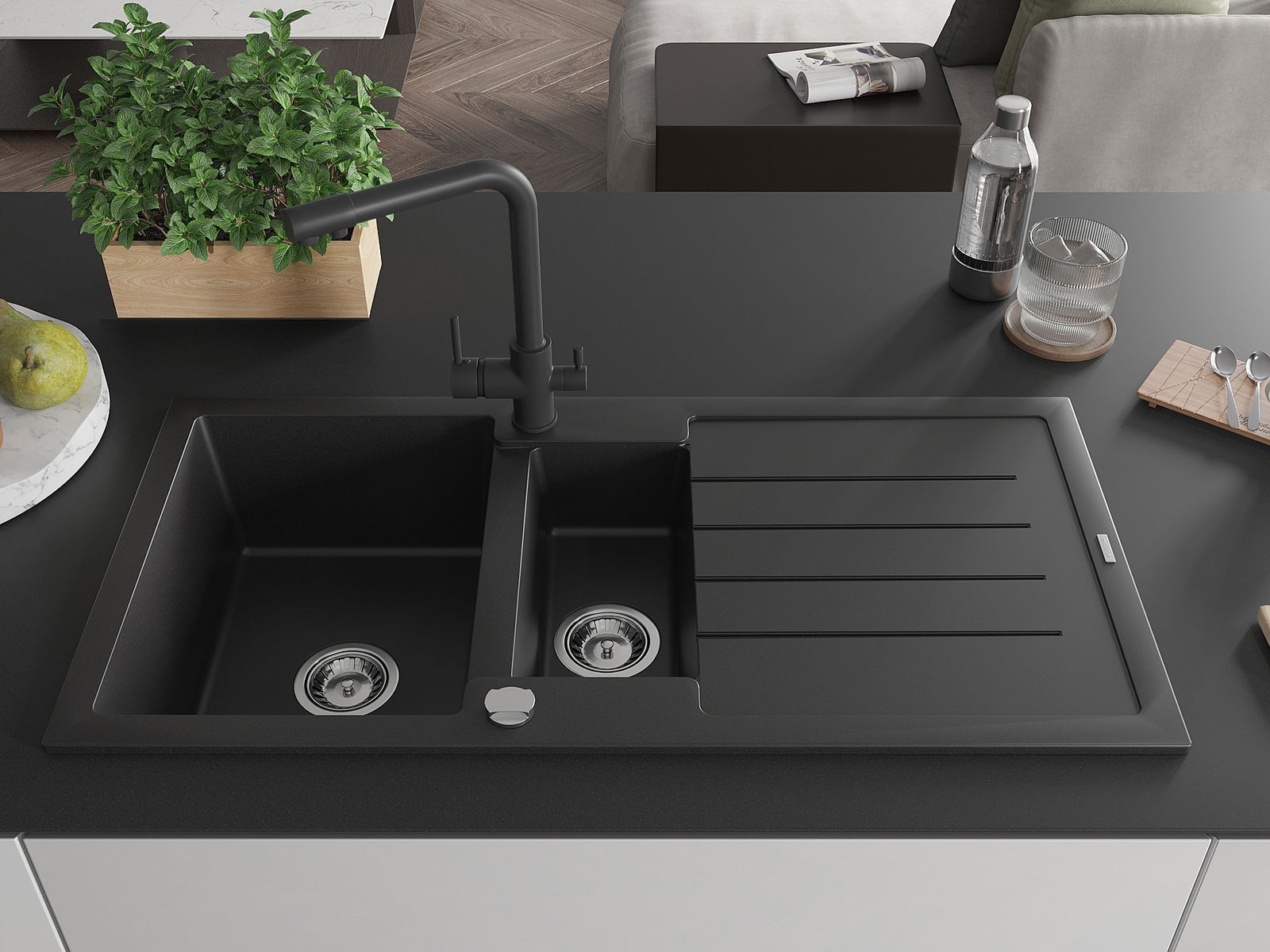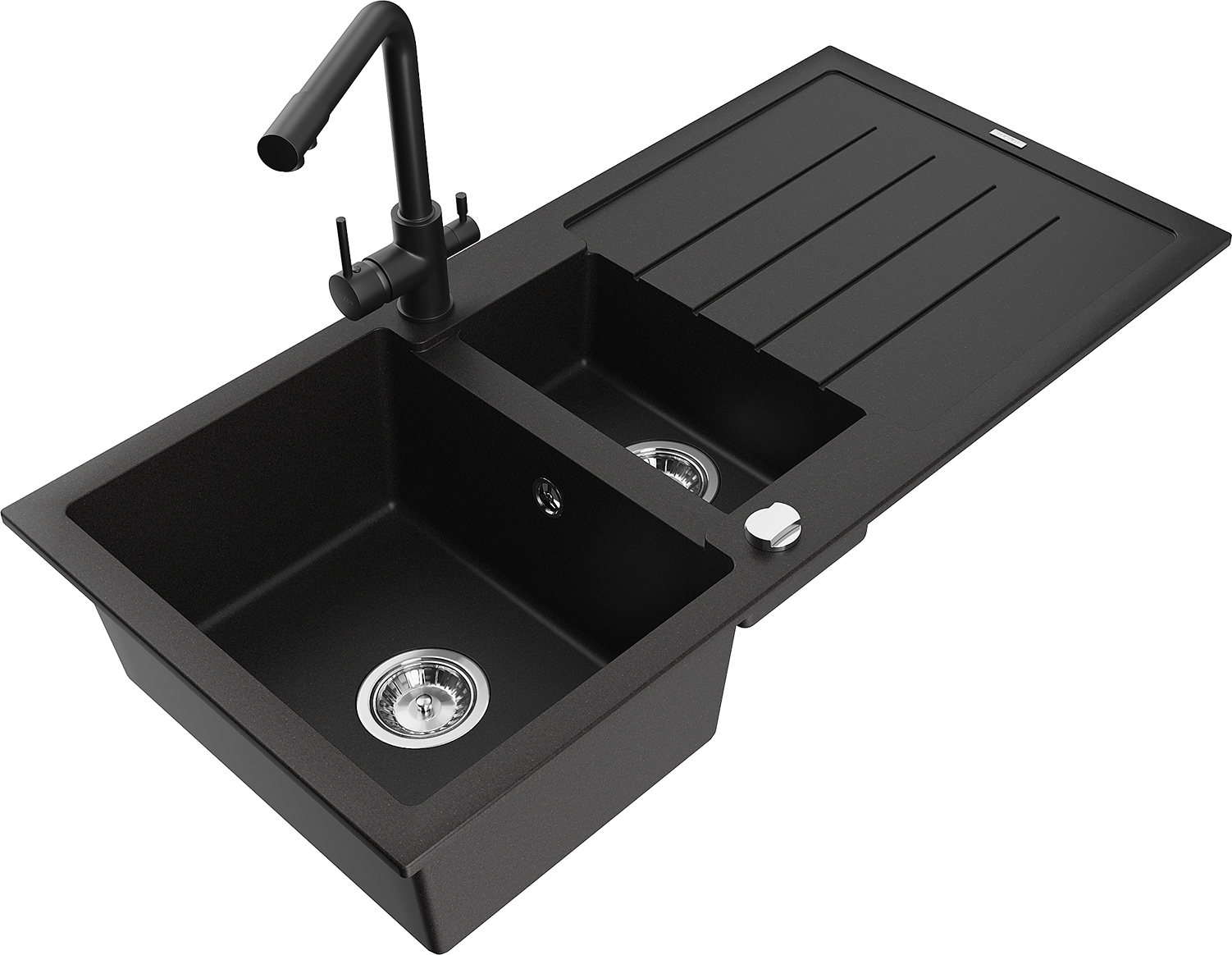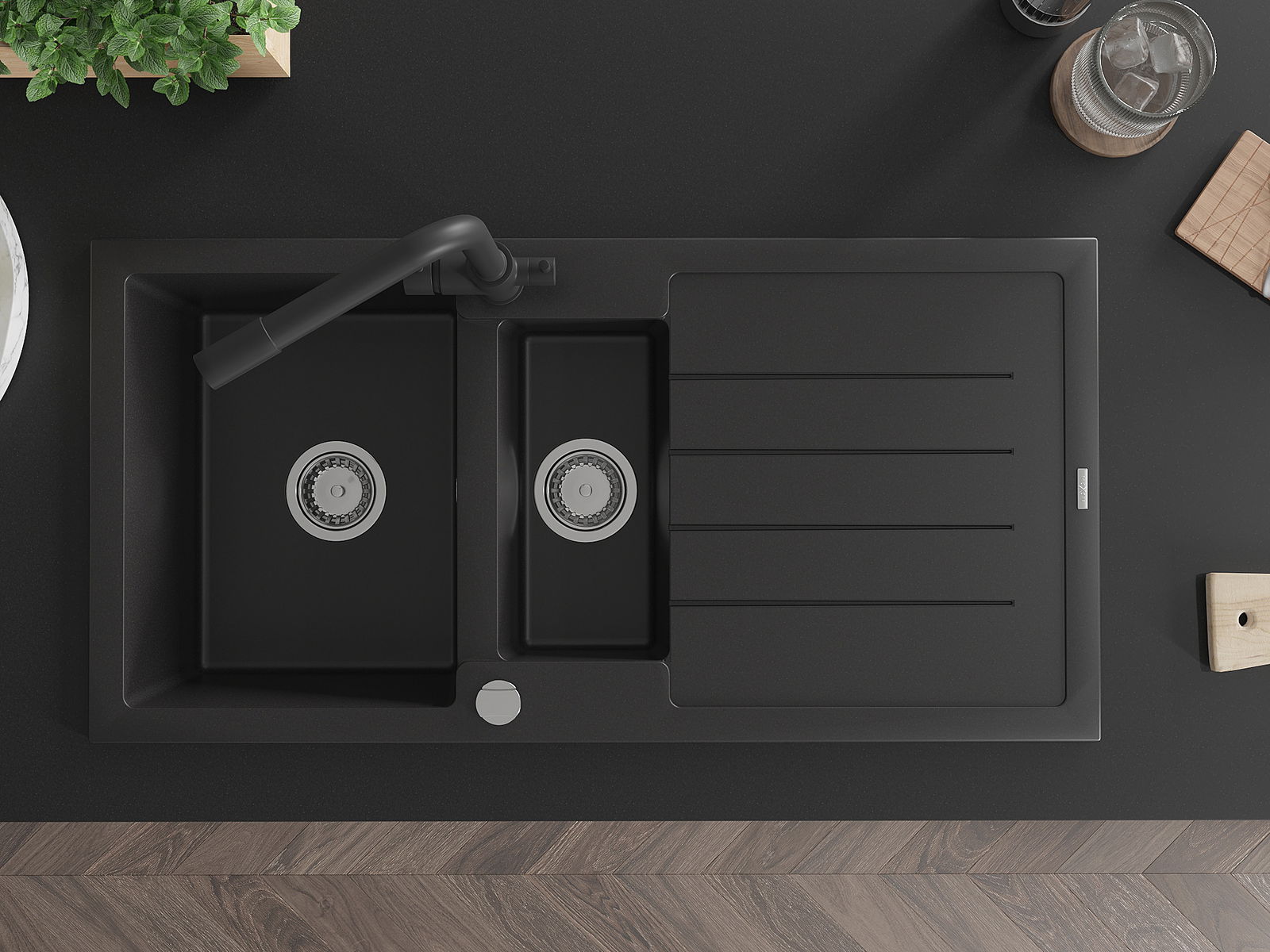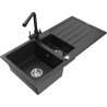 Mexen Andres granitový kuchynský drez 1,5-komorový s odkvapkávačom a kuchynskou batériou Duero, čierny - 6515-77-671600-70