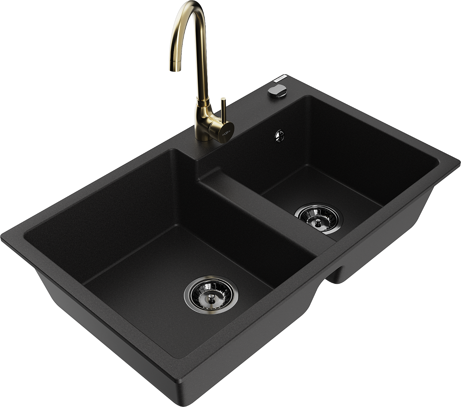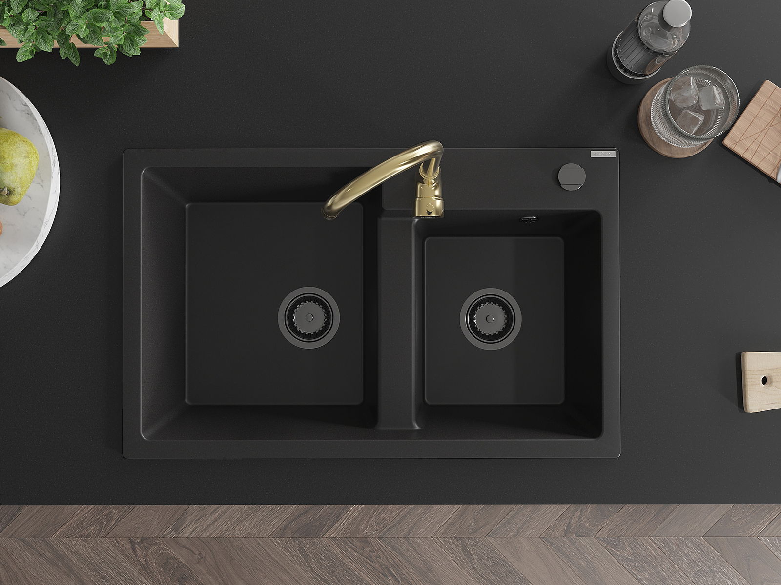 Mexen Tomas žulový kuchynský drez 2-komorový s kuchynskou batériou Telma, čierny - 6516-77-670200-50-B