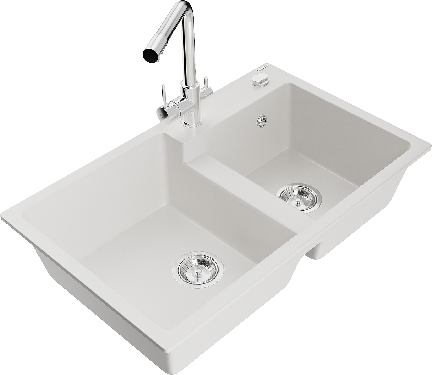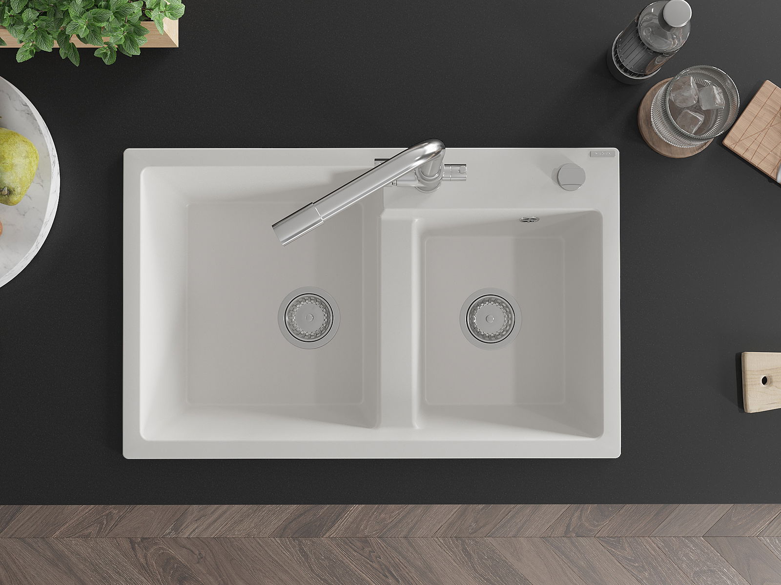 Mexen Tomas granitový drez s 2 komorami a kuchynskou batériou Duero, biely - 6516-20-671600-00