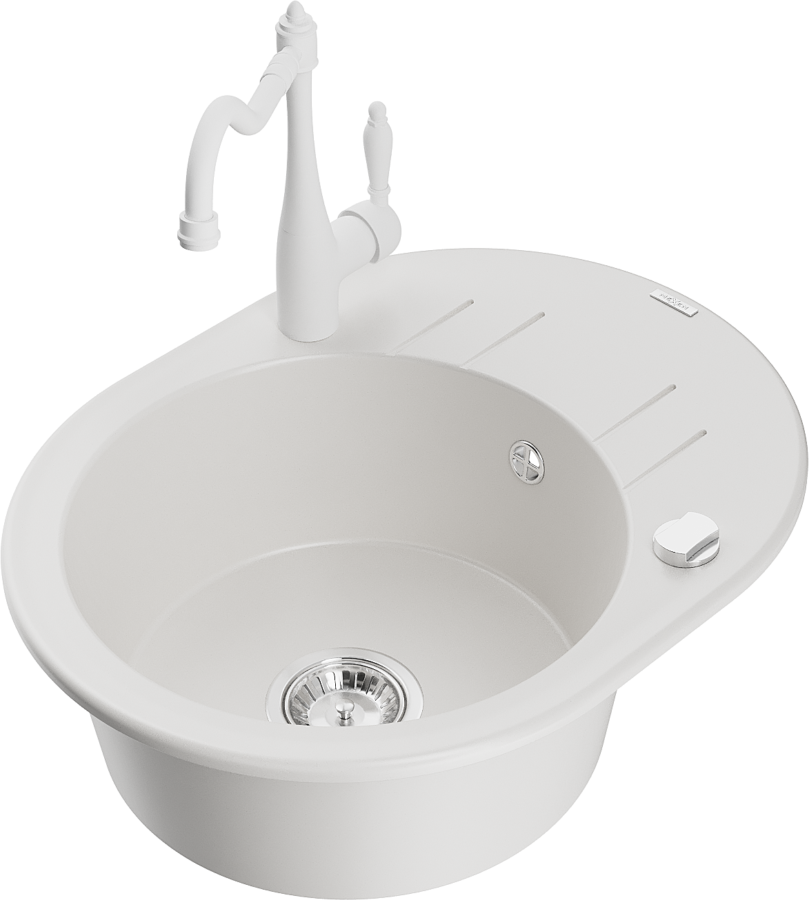 Mexen Kevin granitový drez s 1 komorou a odkvapkávačom a kuchynskou batériou Carla, biely - 6517-20-670700-20