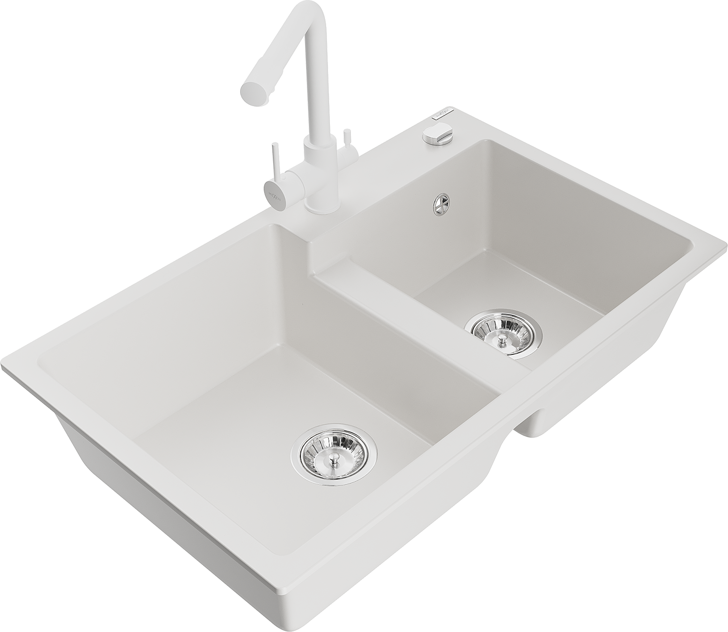 Mexen Tomas žulový dvojkomorový drez s kuchynskou batériou Duero, biely - 6516-20-671600-20